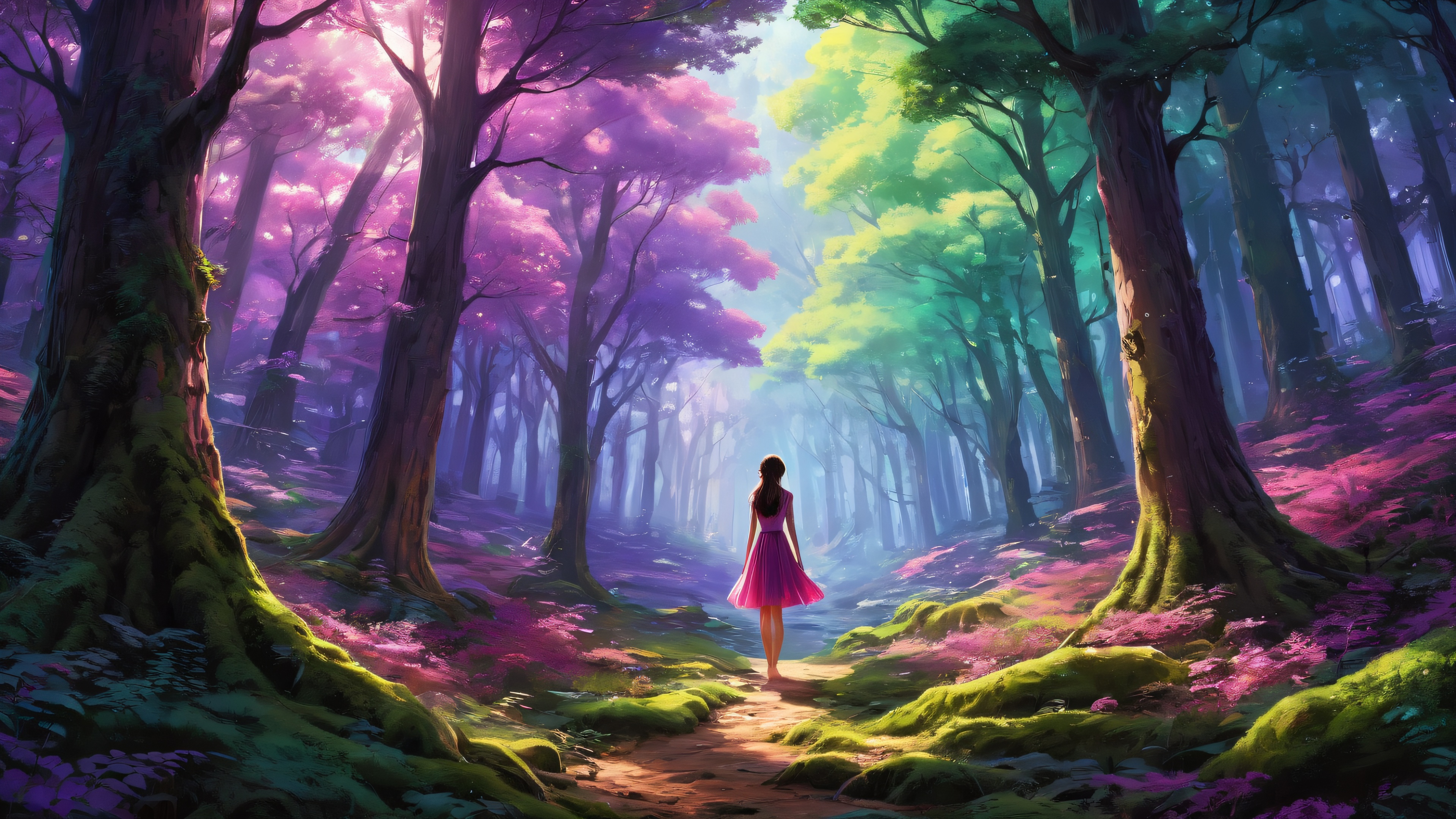A breathtaking desktop wallpaper of Girl in Forest, perfectly clean vast pure void, extreme depth of field, award-winning digital art, pristine clarity, ETHEREAL LIGHTING. Radiant, brilliant colors, ray traced reflections, and pristine clarity. Bright and airy., [‘Deep Carmine’, ‘Saturated Forest Greens’, ‘Moonlit Purples’], 16:9 aspect ratio, ethereal lighting, radiant, brilliant colors, ray traced reflections, pristine clarity, award-winning digital art, epic breathtaking scale, stunning visual impact, perfect composition, highly textured surfaces, intricate micro-details, physically based rendering, macOS wallpaper aesthetic, masterpiece, highest quality, highly detailed, 8k resolution.