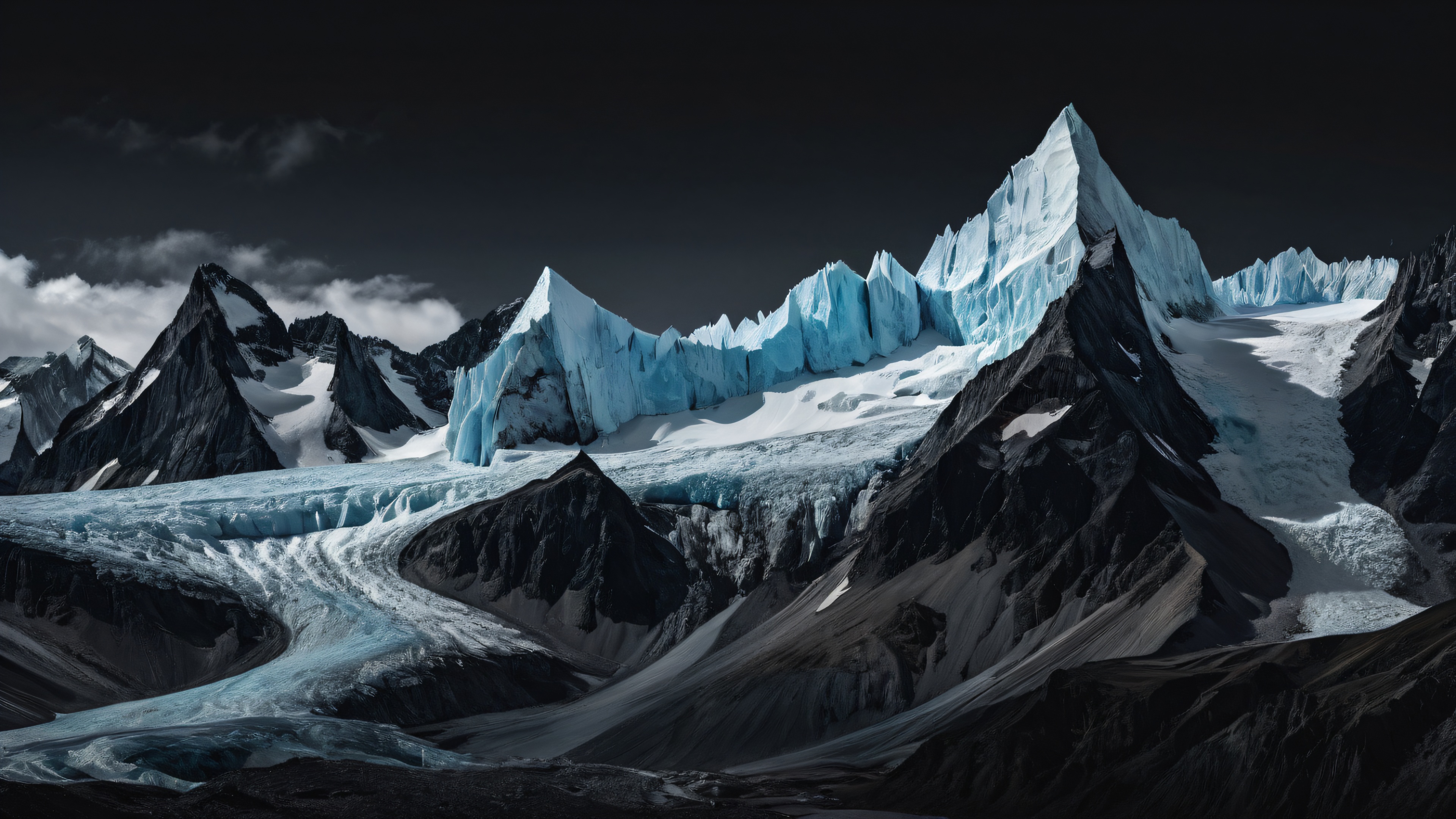 This stunning digital art piece showcases the majesty of glaciers, with an emphasis on their geological formations and textures. The 16:9 aspect ratio and low-key lighting create a dramatic atmosphere, while the deep blacks and striking contrast add depth to the image. Luminescent accents bring a touch of elegance, making this a truly breathtaking visual experience.