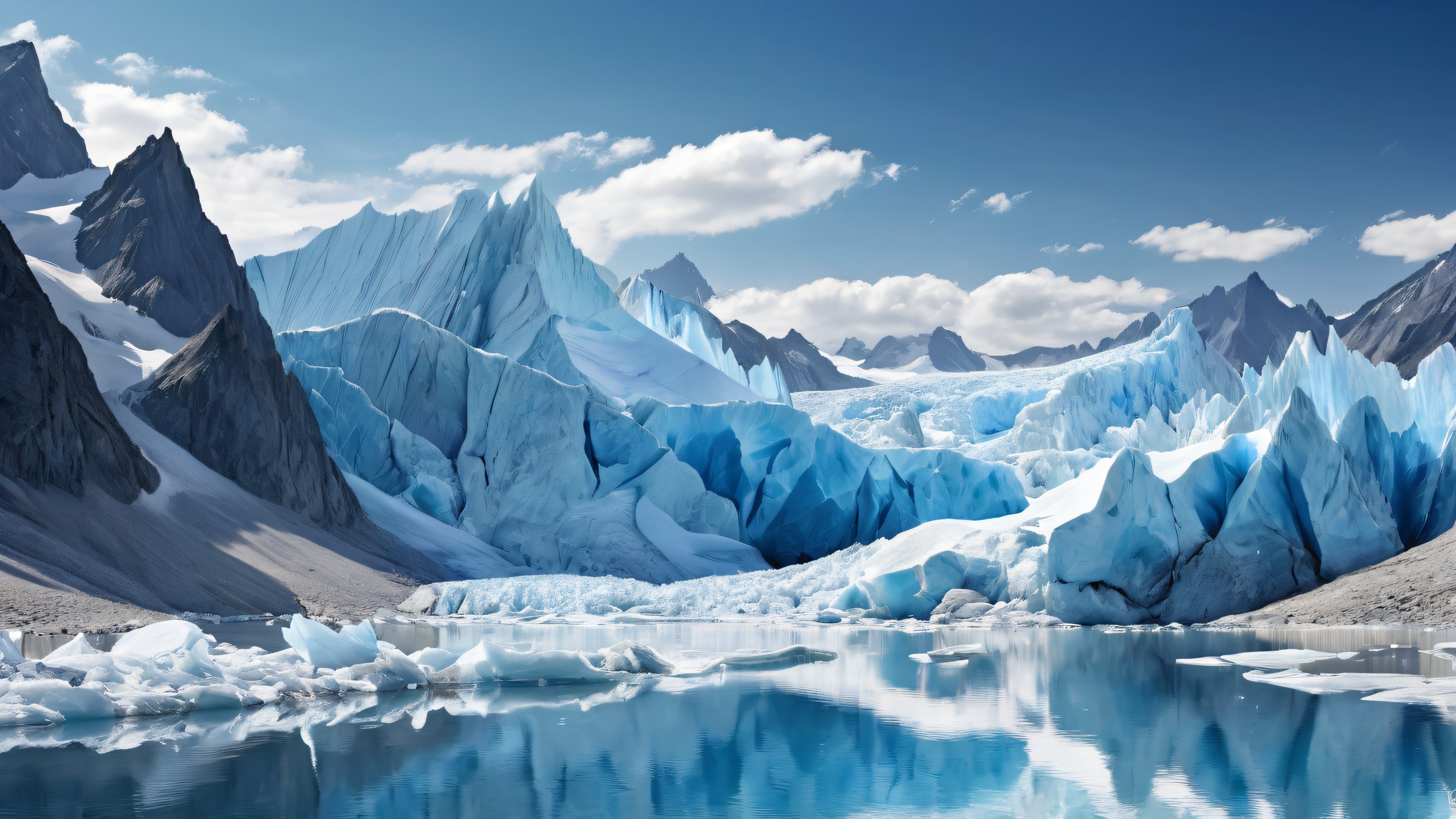 This breathtakingly realistic 8K wallpaper features a vast expanse of pristine glacial surfaces, radiating an ethereal glow. The extreme depth of field allows the viewer to appreciate the intricate micro-details and textured surfaces of the glacier’s crystal-clear ice and surrounding landscape. Award-winning digital art at its finest, perfect for those seeking a masterpiece on their desktop.