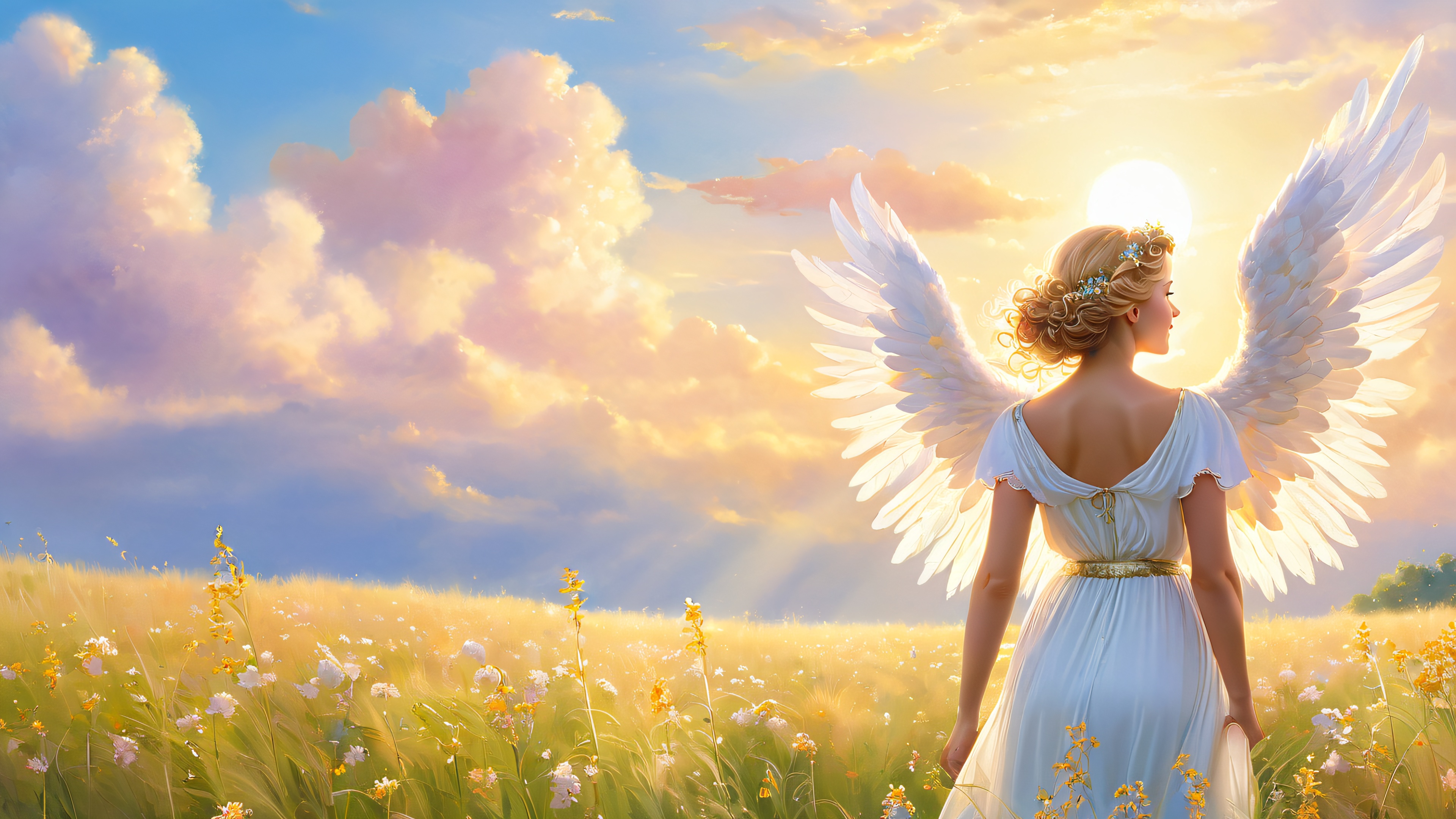 This enchanting 4K wallpaper features a luminous angel with feathery wings gazing serenely up at the sky, where soft clouds drift lazily across the brilliant blue horizon. The angel’s golden curls tumble down her back as she basks in the warm morning sunlight, casting long shadows across the lush meadow filled with wildflowers and tall grasses. Wispy trees dot the landscape, adding a touch of whimsy to this idyllic scene.