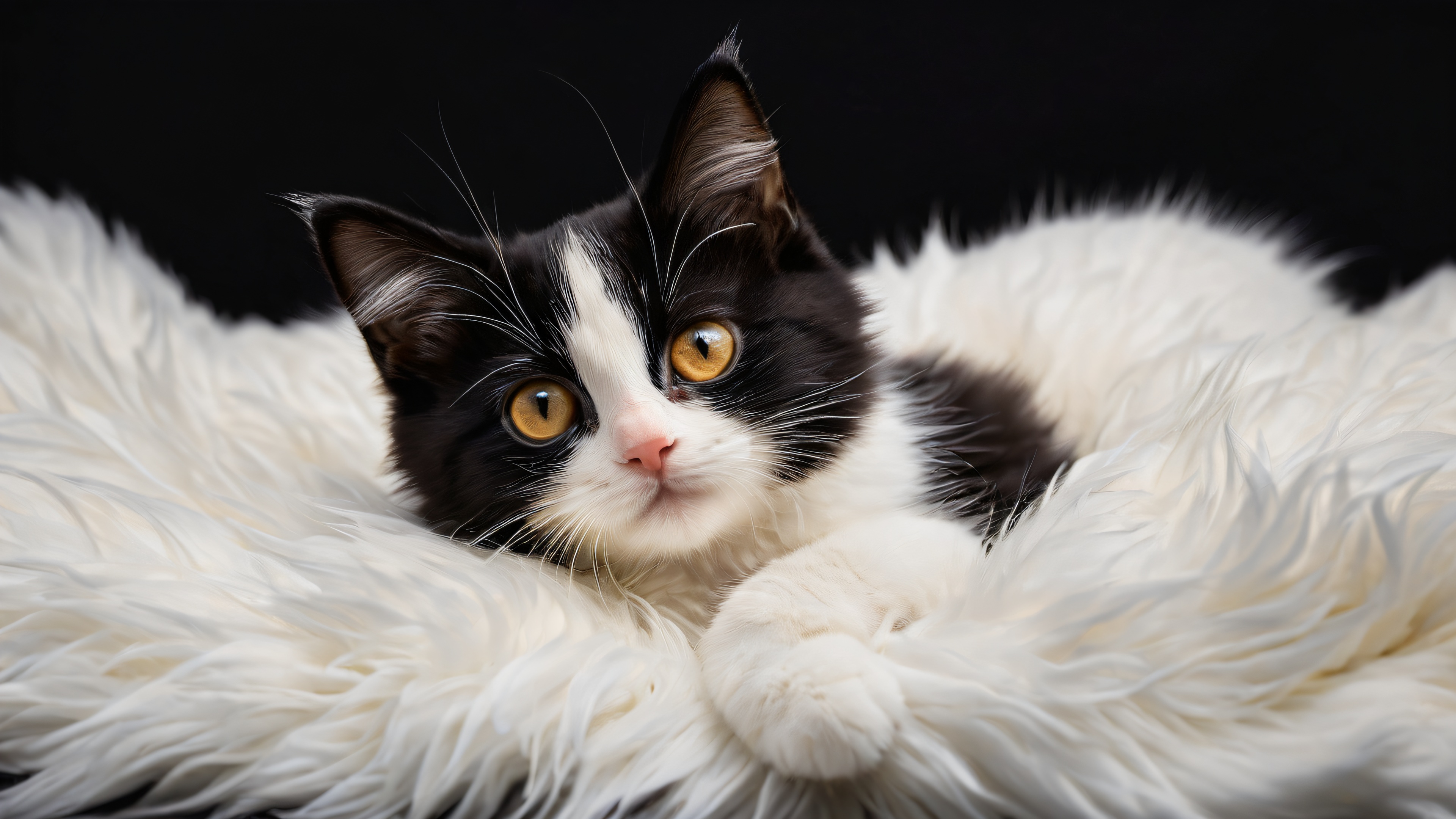 A breathtaking desktop wallpaper of Kitten, Perfectly clean vast pure void, extreme depth of field, soft fuzzy cat bed, Award-winning digital art, pristine clarity, bold vibrant colors, photorealistic background, SLEEK DARK MODE AESTHEThetic: Deep perfect blacks, striking crisp contrast, and elegant luminescent accents, Bold vibrant colors with dominant shades of gold, white, and fluffy cloud-like hues, 16:9 aspect ratio, elegant low-key lighting, deep perfect blacks, striking contrast, sleek dark mode aesthetic, luminescent accents, deep rich colors, award-winning digital art, epic breathtaking scale, stunning visual impact, perfect composition, highly textured surfaces, intricate micro-details, physically based rendering, macOS wallpaper aesthetic, masterpiece, highest quality, highly detailed, 8k resolution.