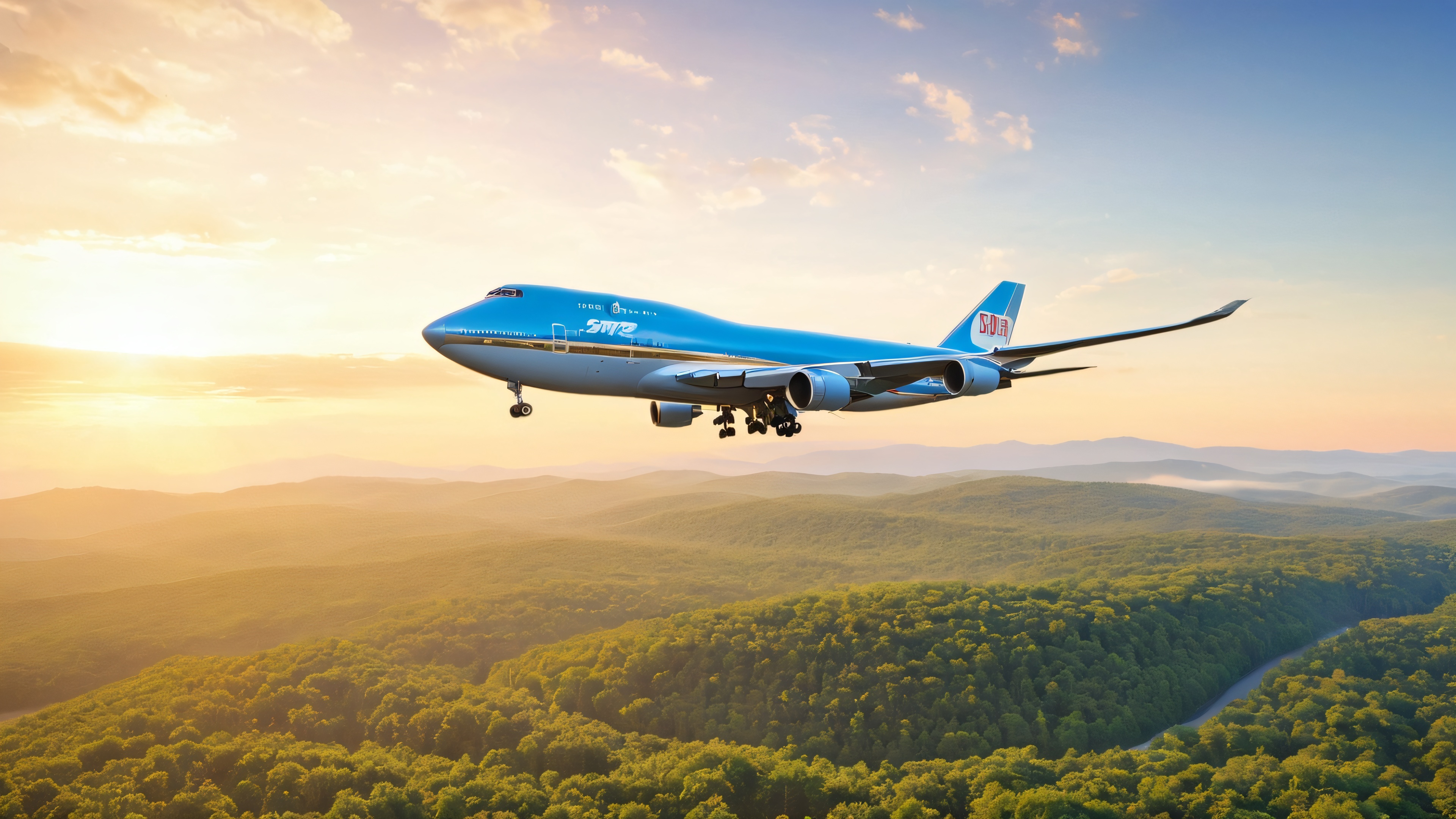 A stunning 4K image of a Boeing 747 cargo plane, emblazoned with the iconic logo of a major US airline, as it glides through a serene late afternoon atmosphere, casting a warm golden glow upon the rolling hills and verdant forests of the Appalachian foothills, with the city of Huntsville and its rich aerospace history stretching out to the horizon.