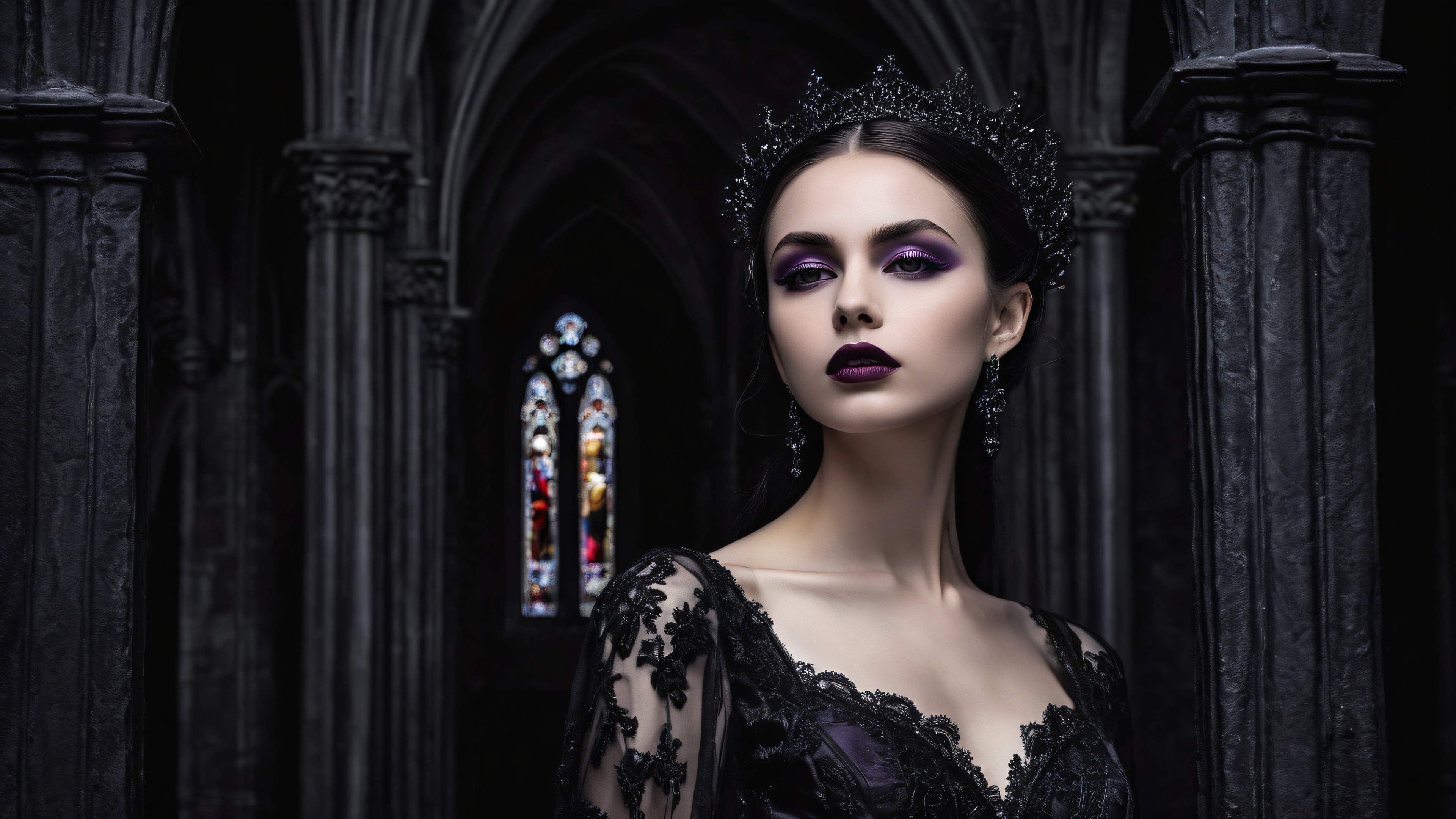 A breathtaking desktop wallpaper of Young Gothic Woman, Perfectly clean vast pure void, extreme depth of field, old black church LA backdrop, Award-winning digital art, pristine clarity, masterfully blended brushstrokes, sophisticated depth and intrigue, SLEEK DARK MODE AESTHETIC. Deep perfect blacks, striking crisp contrast, elegant luminescent accents, Dark, muted tones with purple haze, subtle hints of black and gray, 16:9 aspect ratio, elegant low-key lighting, deep perfect blacks, striking contrast, sleek dark mode aesthetic, luminescent accents, deep rich colors, award-winning digital art, epic breathtaking scale, stunning visual impact, perfect composition, highly textured surfaces, intricate micro-details, physically based rendering, macOS wallpaper aesthetic, masterpiece, highest quality, highly detailed, 8k resolution.