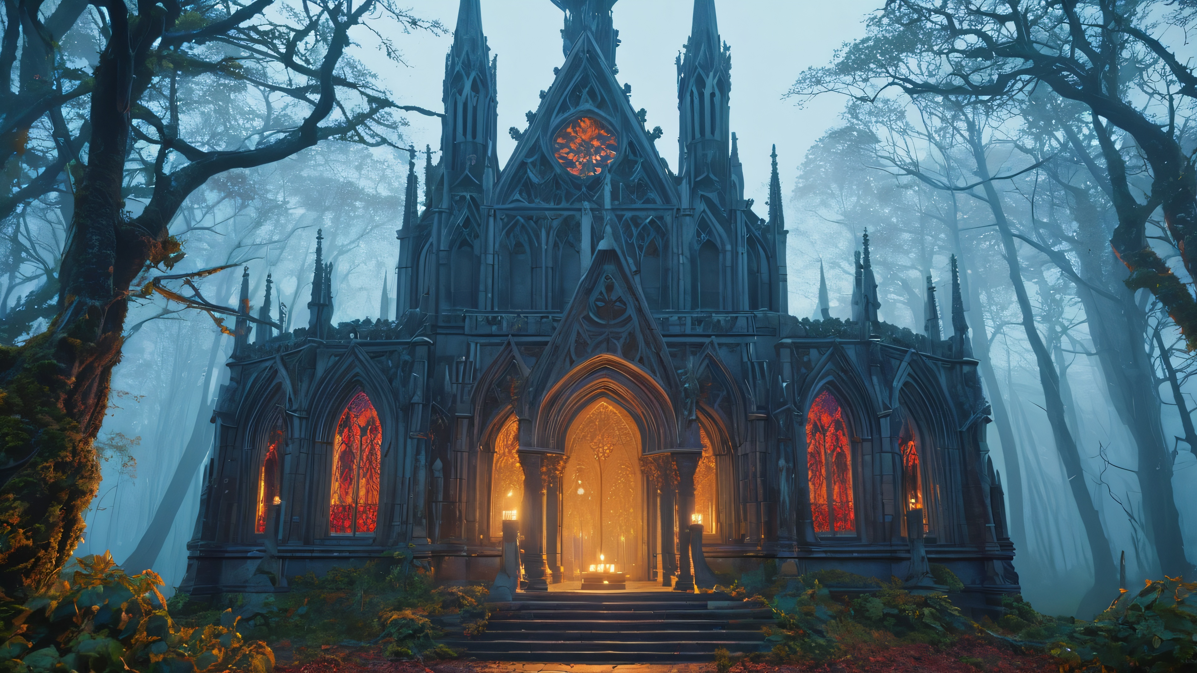 This breathtaking desktop wallpaper features a hauntingly beautiful gothic mausoleum set against the backdrop of a mystical twilight forest. The undulating mist creates an eerie atmosphere as candlelight flickers through stained-glass windows, casting shadows on the ornate stone sarcophagi containing ancient warriors and monarchs in tattered finery. A lone figure approaches the entrance, their eyes glowing with an otherworldly light amidst a landscape of twisted trees, overgrown underbrush, and crumbling ruins.