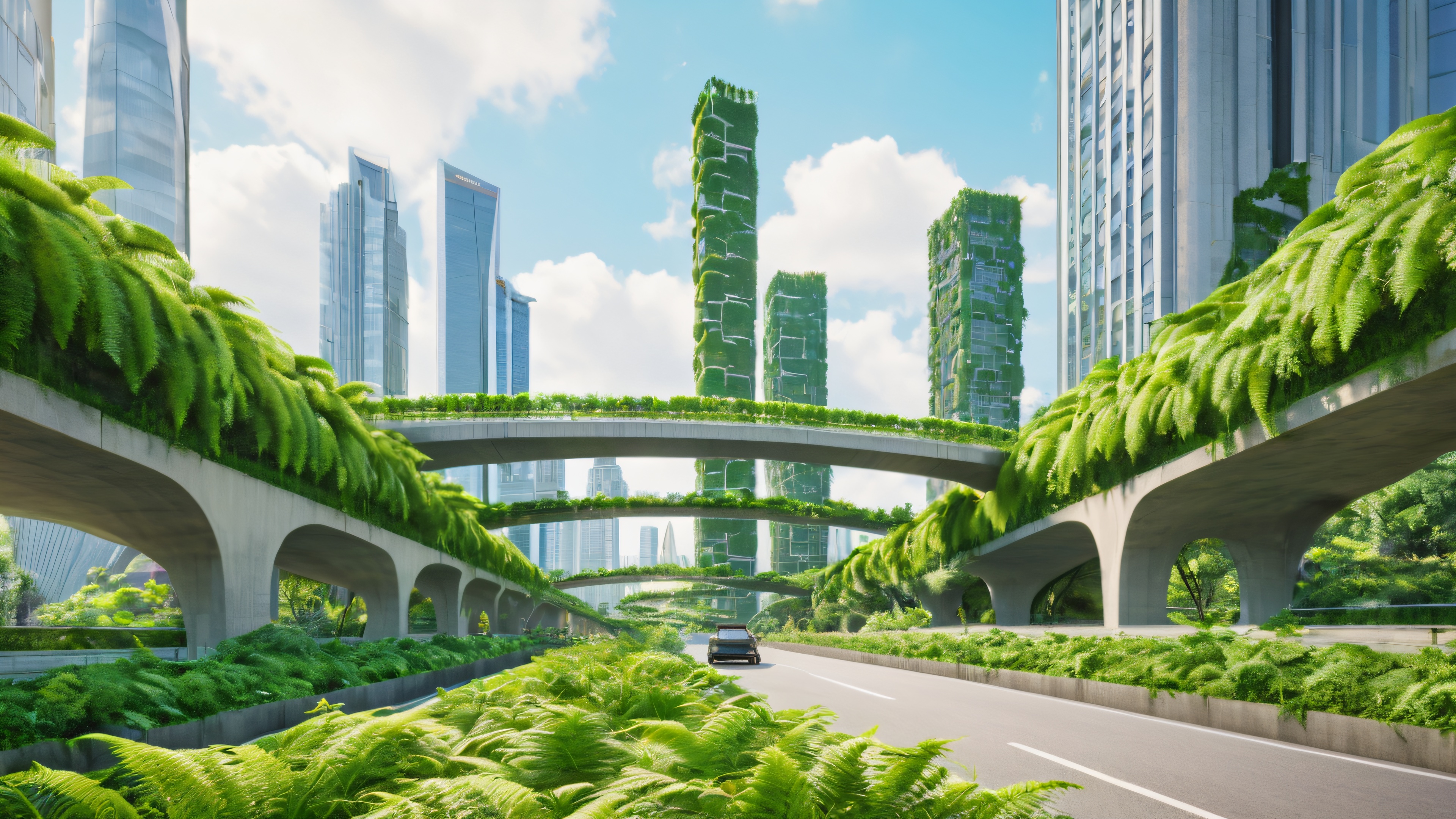 A stunning 4K illustration of an overpass transformed into a thriving ecosystem, with lush greenery and organic patterns weaving together. Soft sunlight filters through the foliage, casting a warm glow on the surface. Dominant hues of green, with accents of golden light and metallic sheen.