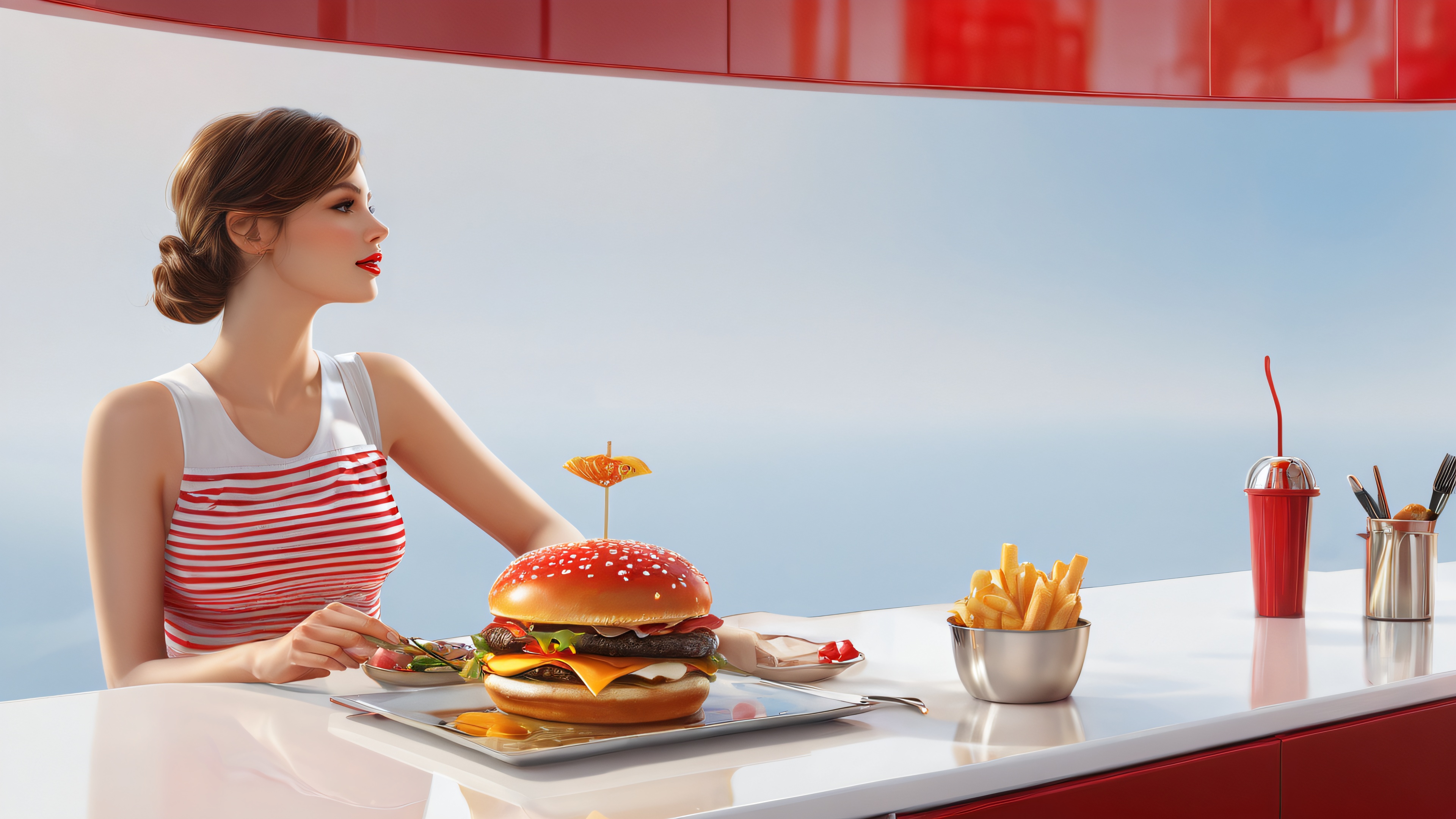 A breathtaking desktop wallpaper of Hamburger Woman, Perfectly clean vast pure void, extreme depth of field, Award-winning digital art, pristine clarity, Ethereal lighting. Radiant, brilliant colors, ray-traced reflections, and pristine clarity. Bright and airy., Bright Red, White, and Golden, 16:9 aspect ratio, ethereal lighting, radiant, brilliant colors, ray traced reflections, pristine clarity, award-winning digital art, epic breathtaking scale, stunning visual impact, perfect composition, highly textured surfaces, intricate micro-details, physically based rendering, macOS wallpaper aesthetic, masterpiece, highest quality, highly detailed, 8k resolution.