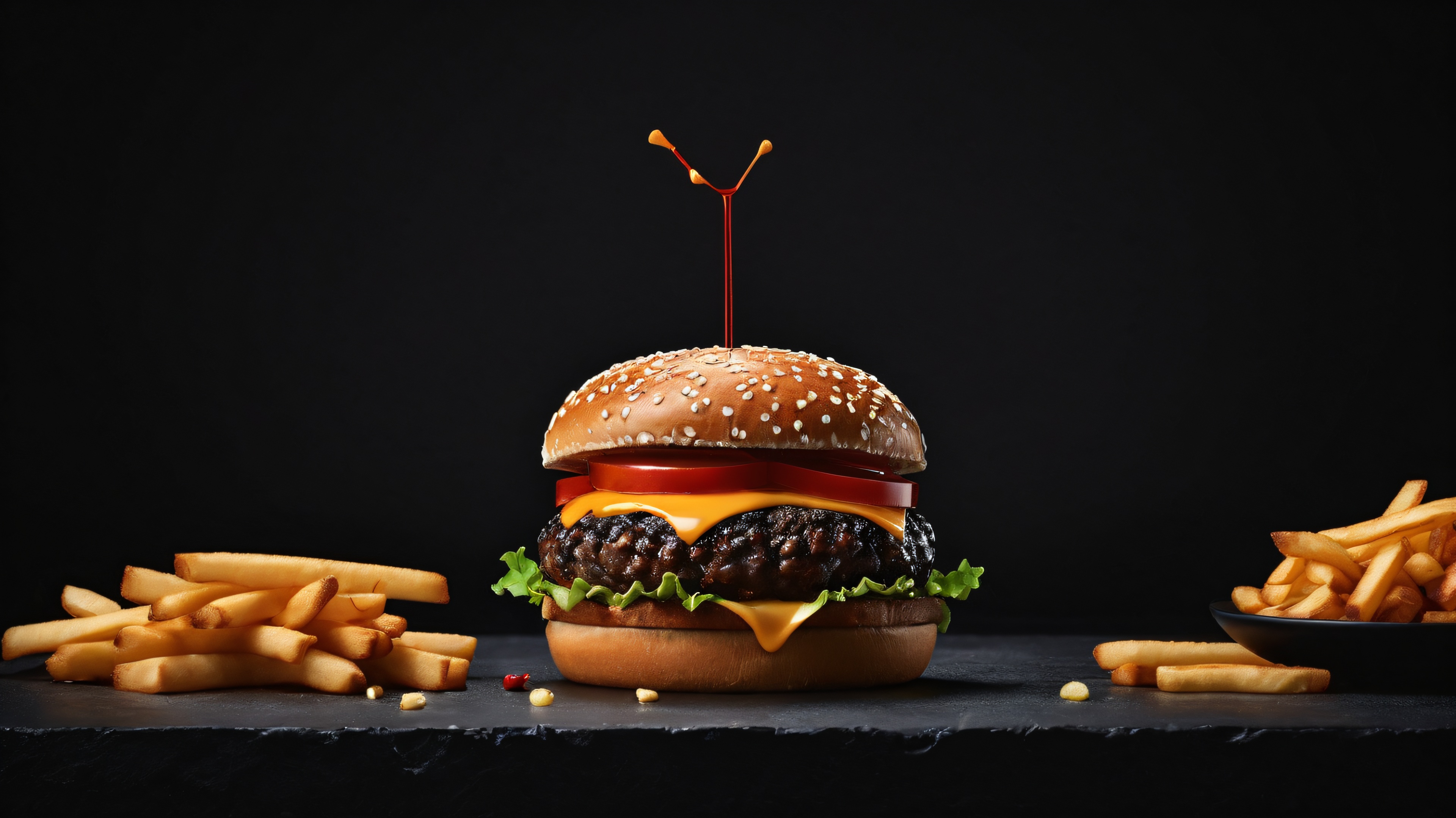 A breathtaking desktop wallpaper of Hamburger Woman, perfectly clean vast pure void, extreme depth of field, subtle sparkle, award-winning digital art, pristine clarity, whimsical illustration, SLEEK DARK MODE AESTHETIC. Deep perfect blacks, striking crisp contrast, and elegant luminescent accents., [‘Rich Red’, ‘Creamy White’, ‘Golden Brown’], 16:9 aspect ratio, elegant low-key lighting, deep perfect blacks, striking contrast, sleek dark mode aesthetic, luminescent accents, deep rich colors, award-winning digital art, epic breathtaking scale, stunning visual impact, perfect composition, highly textured surfaces, intricate micro-details, physically based rendering, macOS wallpaper aesthetic, masterpiece, highest quality, highly detailed, 8k resolution.