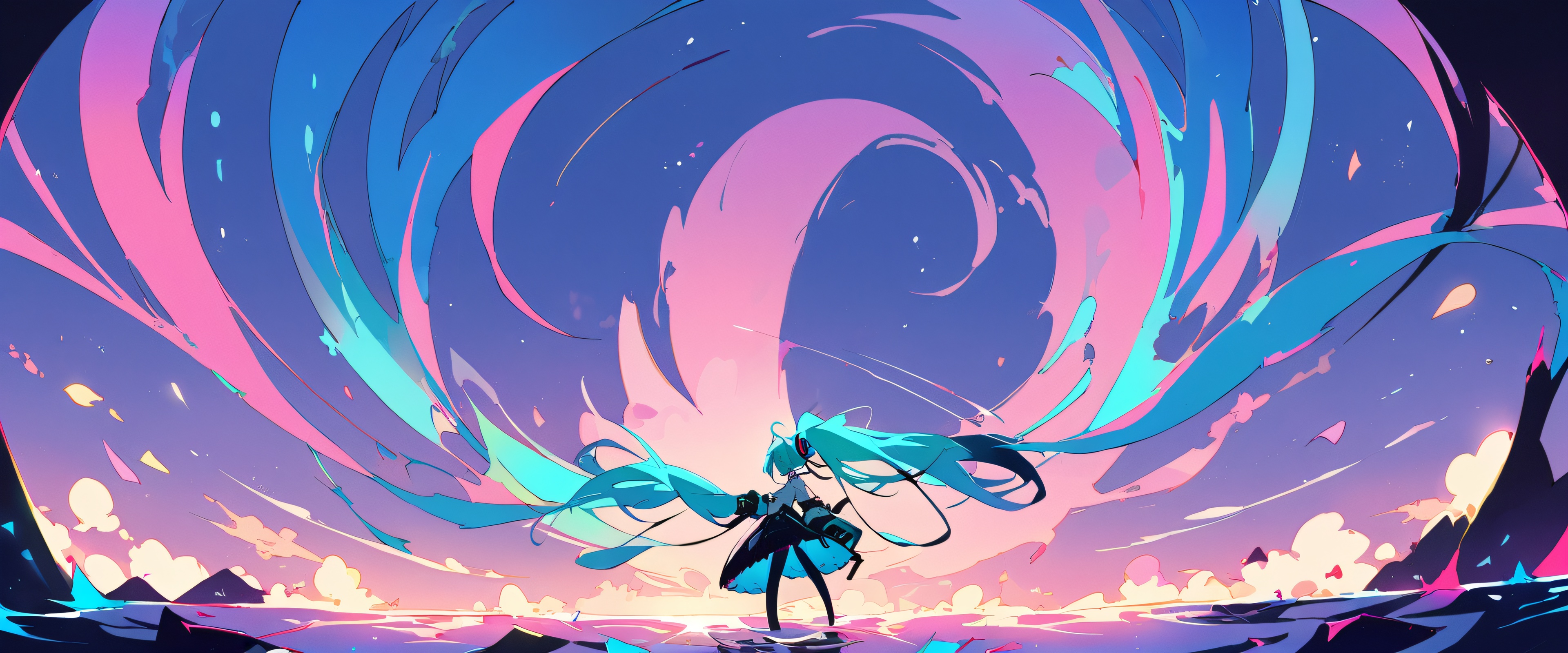 1girl, hatsune miku, vocaloid, solo, masterpiece, best quality, very aesthetic, absurdres, highly detailed, looking at viewer, Perfectly clean vast pure void, extreme depth of field, [‘Deep blues’, ‘Soothing whites’], 21:9 ultrawide panoramic aspect ratio, epic wide shot, bright and airy, ethereal lighting, beautiful sky, cinematic lighting, vivid colors