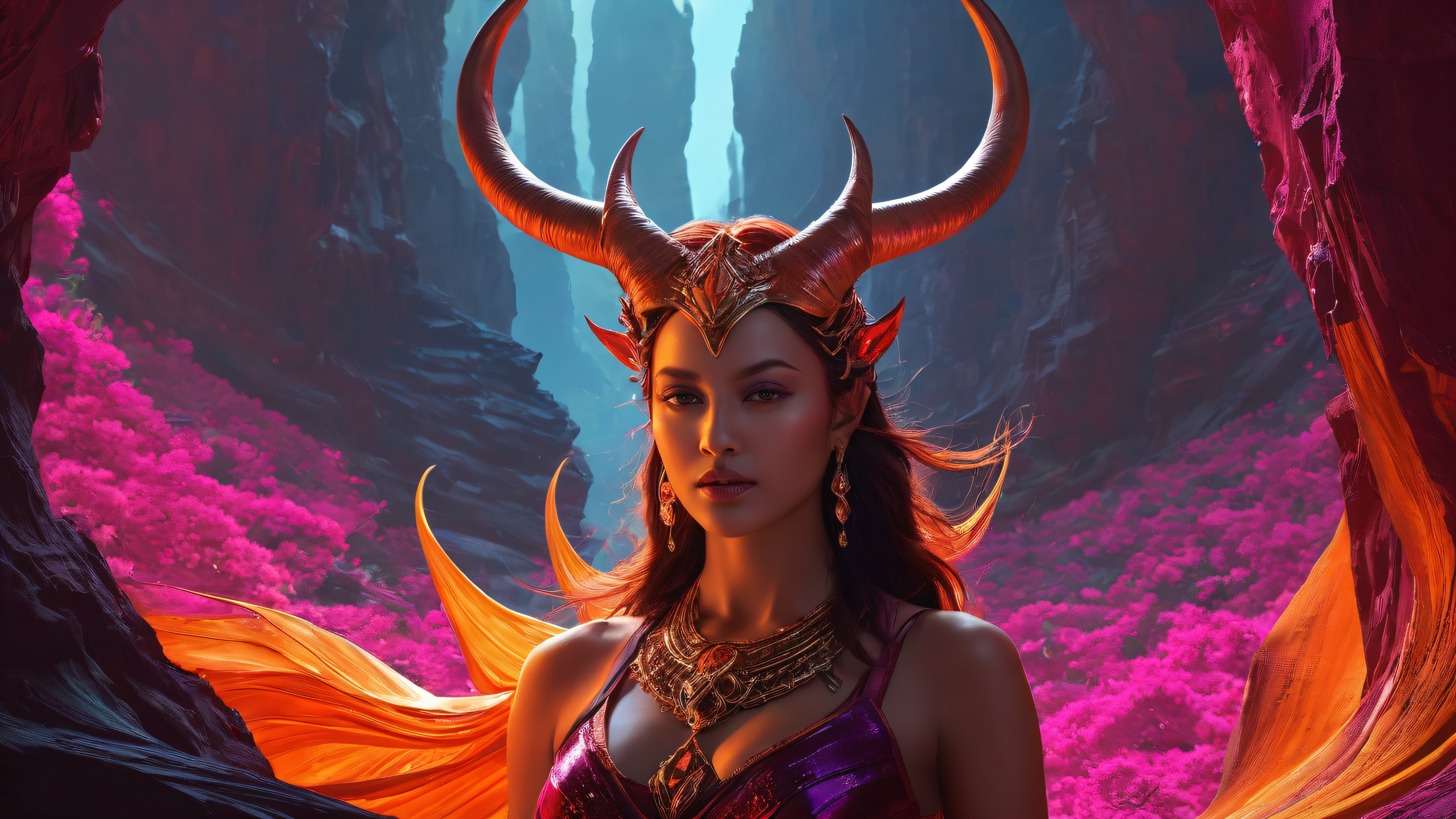 This breathtaking digital art masterpiece presents a majestic Horned Queen set against a pristine, empty space that stretches to infinity. The intense orange and magenta hues evoke a sense of drama and scale, while the ethereal lighting and ray traced reflections create an otherworldly ambiance. Every detail, from the intricate textures to the micro-details, is meticulously crafted to deliver a visually stunning experience.