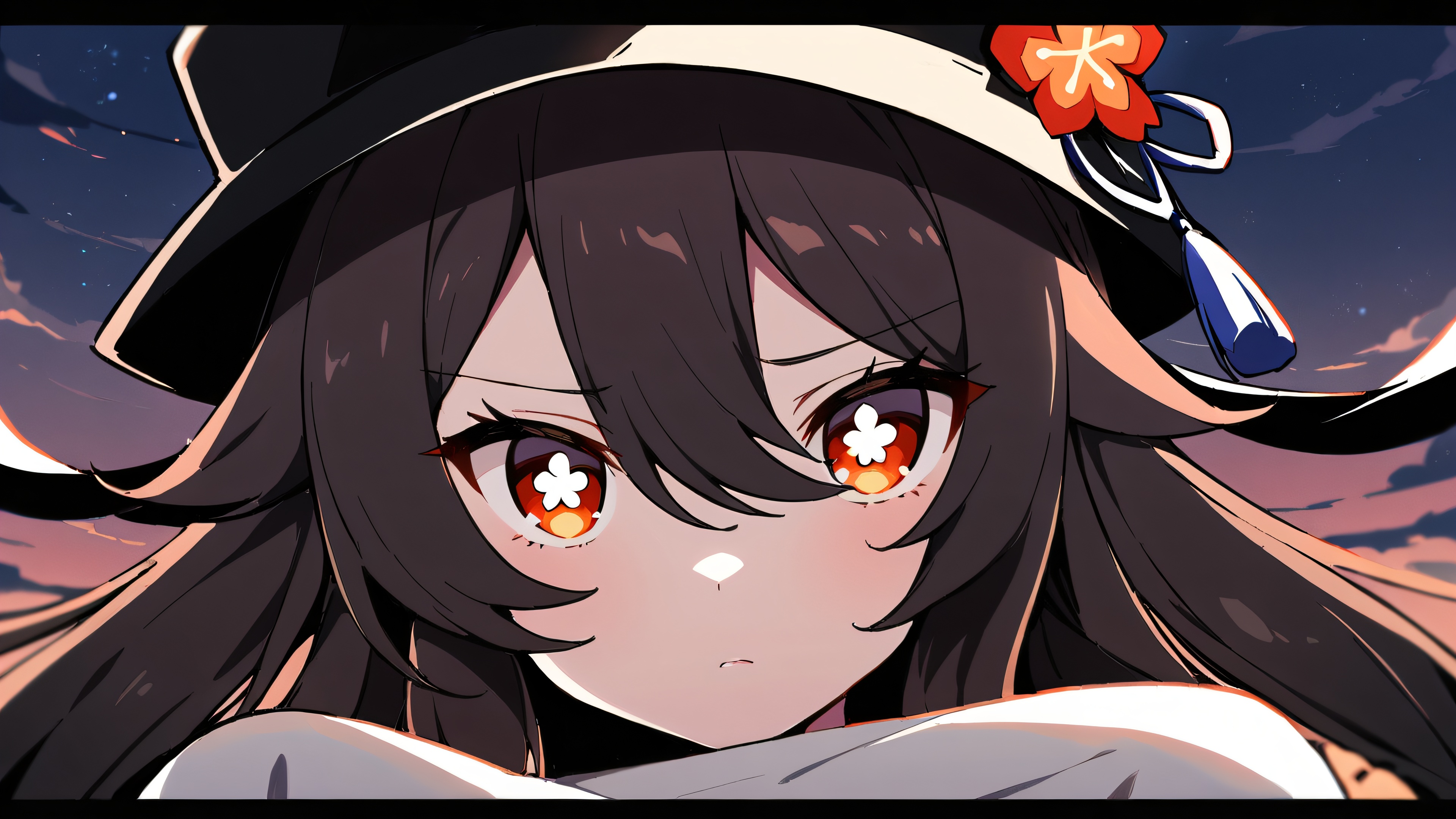 1girl, hu tao, genshin impact, solo, masterpiece, best quality, very aesthetic, absurdres, highly detailed, looking at viewer, perfectly clean vast pure void, extreme depth of field, [‘#FF69B4’, ‘#3498DB’], 16:9 aspect ratio, bright and airy, ethereal lighting, beautiful sky, cinematic lighting, vivid colors