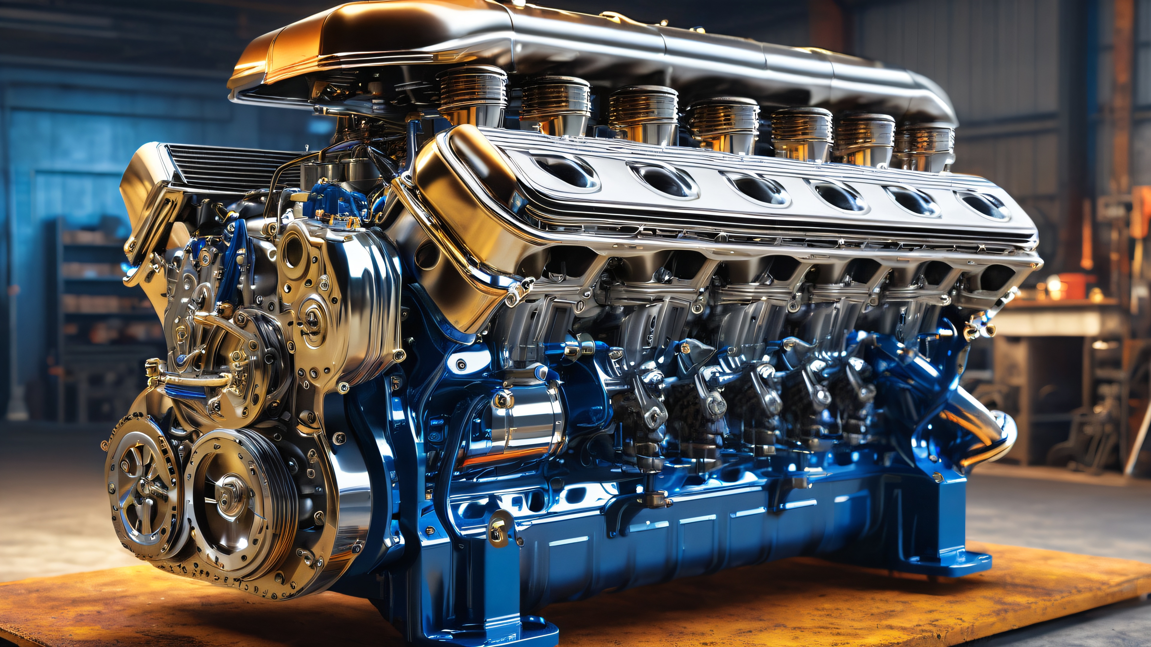 Majestic V8 engine with gleaming metal exterior and moving parts, set in an industrial garage with rusty tools and machinery.