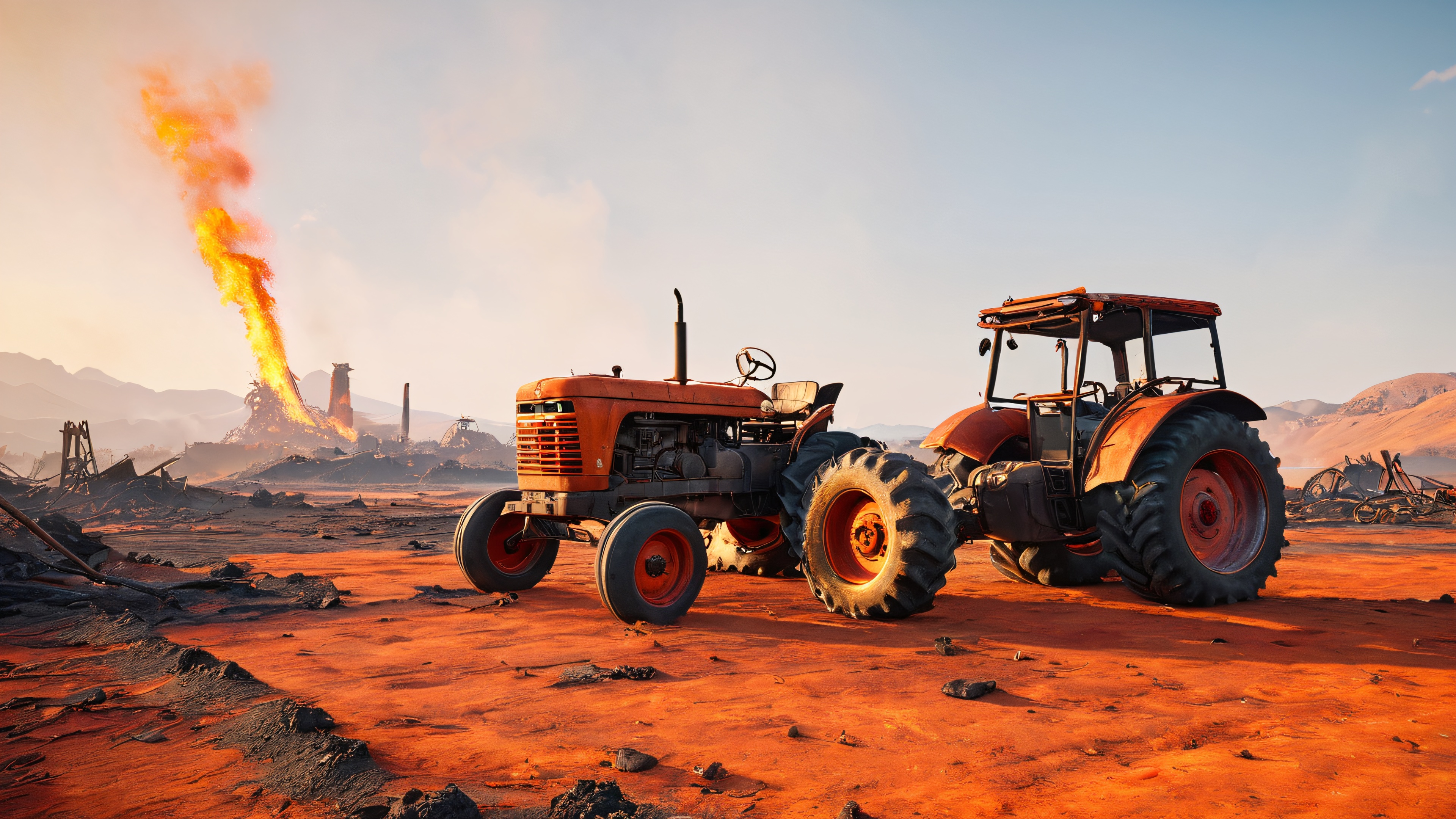 The image features a hyper-realistic rendering of an industrial-strength tractor traversing a desolate landscape scarred by intense heat and flames. The tractor’s metal body has a fiery orange-red hue, weathered from the harsh environment. Flames crackle in the distance, belching smoke and ash into the air, while the surrounding vegetation is reduced to blackened skeletal remains. The dominant palette of oranges, reds, and smoky greys creates a cinematic atmosphere with warm golden lighting casting long shadows across the charred landscape.