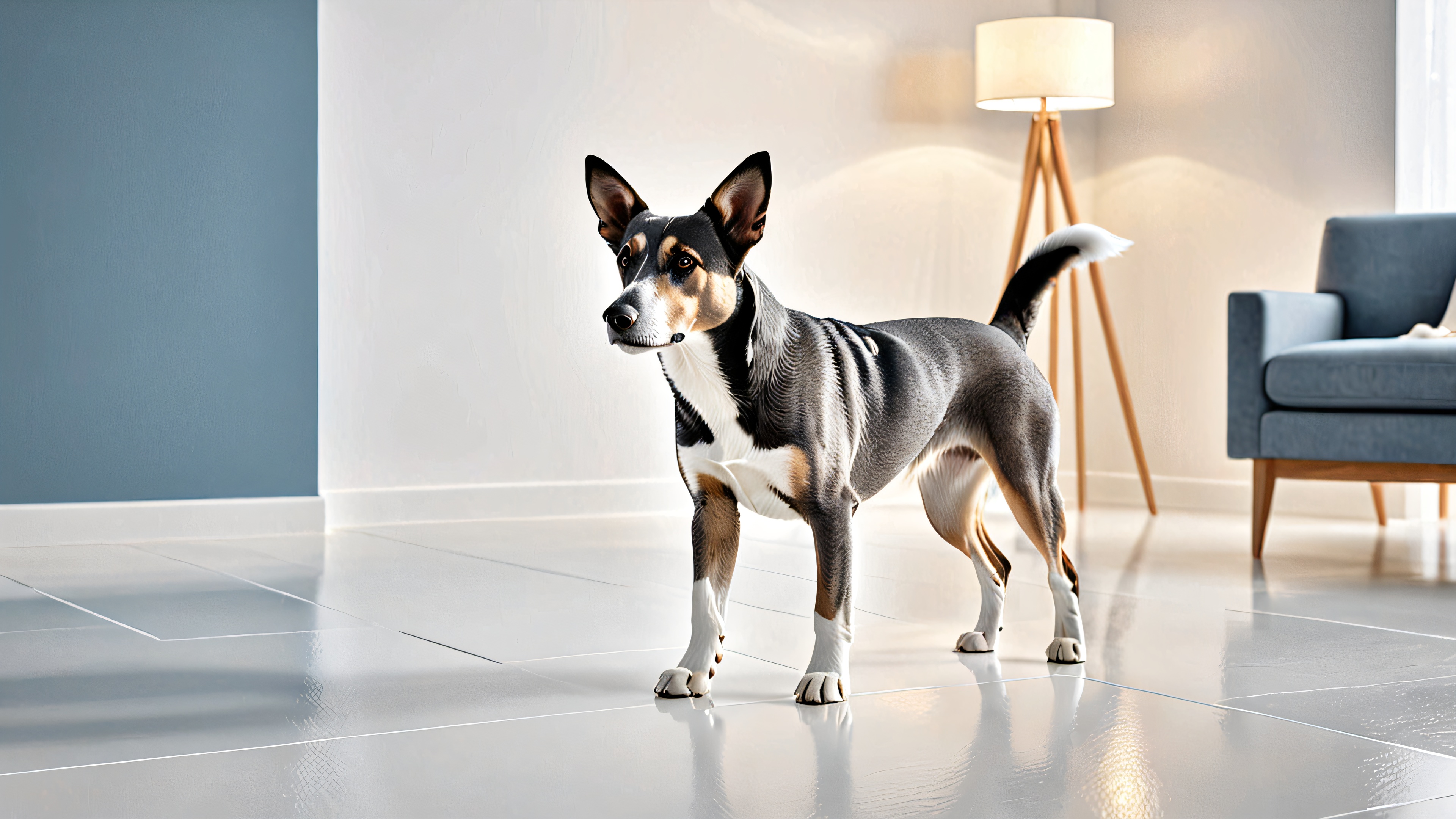 This stunning 4K desktop wallpaper features a sleek, gray dog with a mesmerizing gaze effortlessly gliding across a spotless floor. The scene is set in a modern room with clean lines and smooth surfaces, devoid of any clutter or distractions. The dog’s movement is captured in hyper-realistic 3D render with subtle texture and depth, blending seamlessly with the surrounding environment. Soft, warm lighting casts a gentle glow on the scene, accentuating the dog’s fur and the environment, creating a sense of comfort and serenity.
