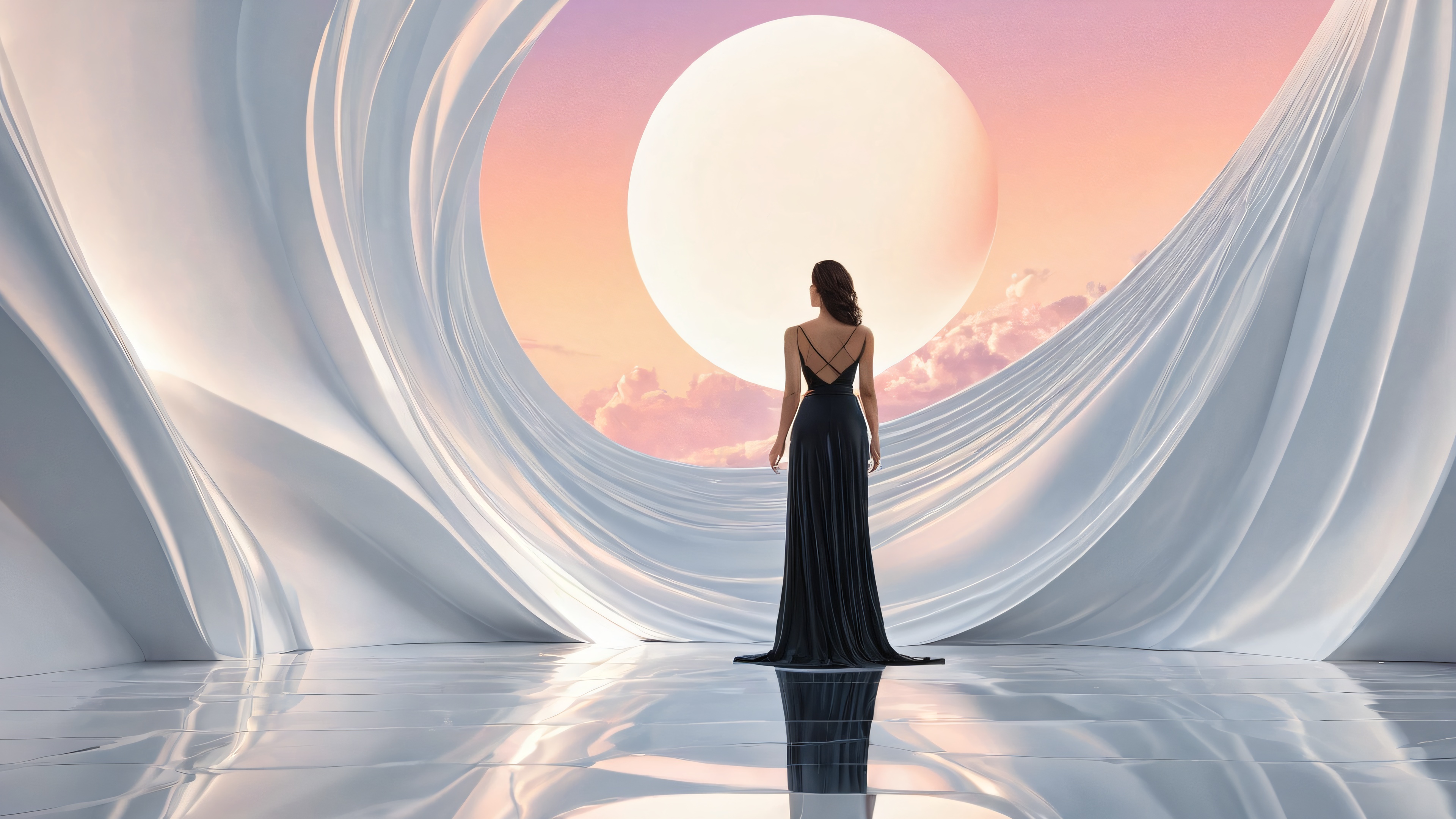 A breathtaking desktop wallpaper of Woman, A perfectly clean vast pure void with an extreme depth of field, allowing the subject to stand out in perfect isolation., Award-winning digital art, pristine clarity, high-quality and high-res renderings with a focus on intricate details and textures., Ethereal lighting with radiant, brilliant colors, ray-traced reflections, and pristine clarity. The light is bright and airy, yet subtle enough not to overpower the subject., [‘Black’, ‘Neutral’], 16:9 aspect ratio, ethereal lighting, radiant, brilliant colors, ray traced reflections, pristine clarity, award-winning digital art, epic breathtaking scale, stunning visual impact, perfect composition, highly textured surfaces, intricate micro-details, physically based rendering, macOS wallpaper aesthetic, masterpiece, highest quality, highly detailed, 8k resolution.