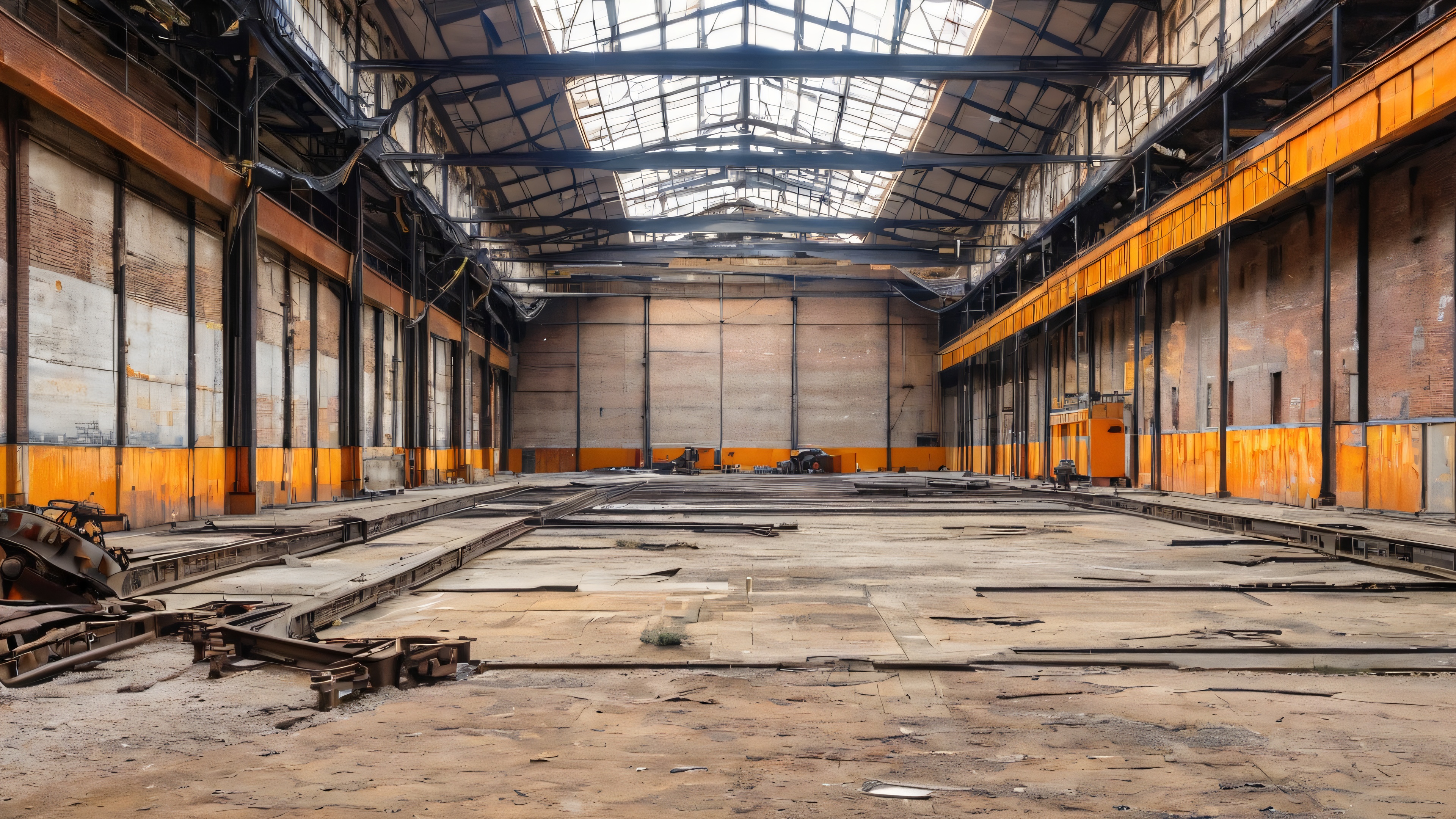 This high-contrast industrial scene captures the decaying grandeur of a once-thriving engineering workshop. Cranes, machinery, and half-finished projects lie still, amidst a backdrop of worn surfaces and peeling paint. Flickering fluorescent lights cast eerie shadows, while cobwebs hang like tapestries.