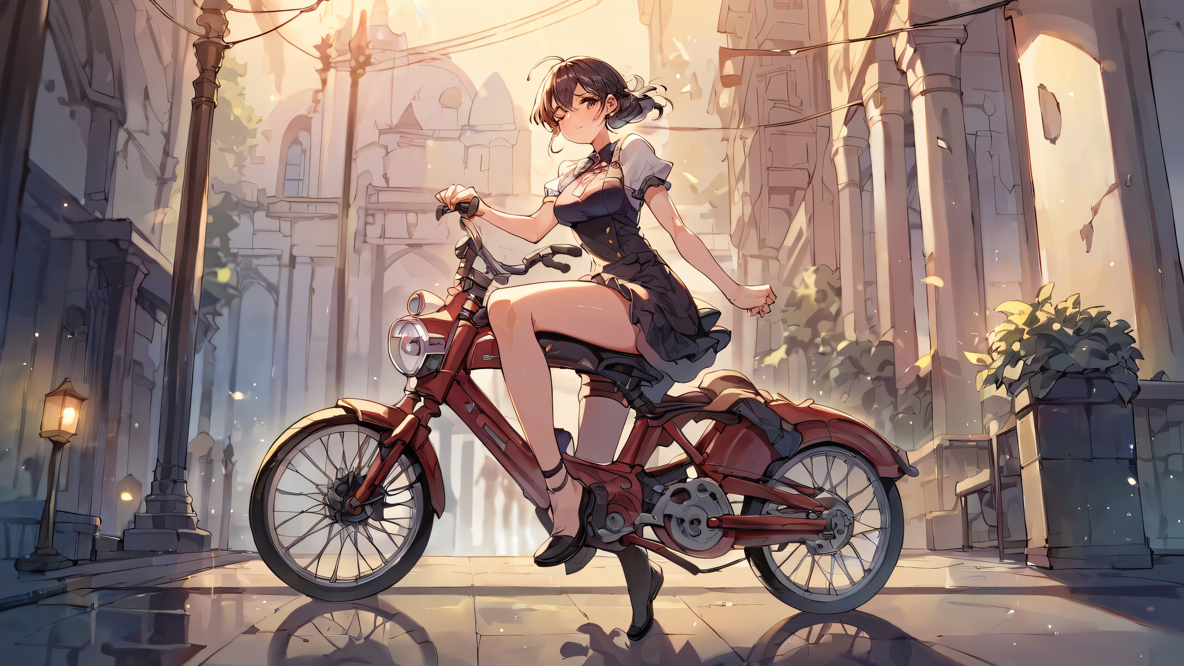 score_9, score_8_up, score_7_up, source_anime, Girl Riding Bike, 完璧にきれいな広大な純粋な虚空, 極端な被写界深度, [‘Brown’, ‘White’], stunning anime illustration, 傑作, best quality, 非常に詳細な, 8k解像度, 16:9 アスペクト比, elegant low-key lighting, 印象的なコントラスト, deep perfect blacks, night scene, cinematic atmosphere