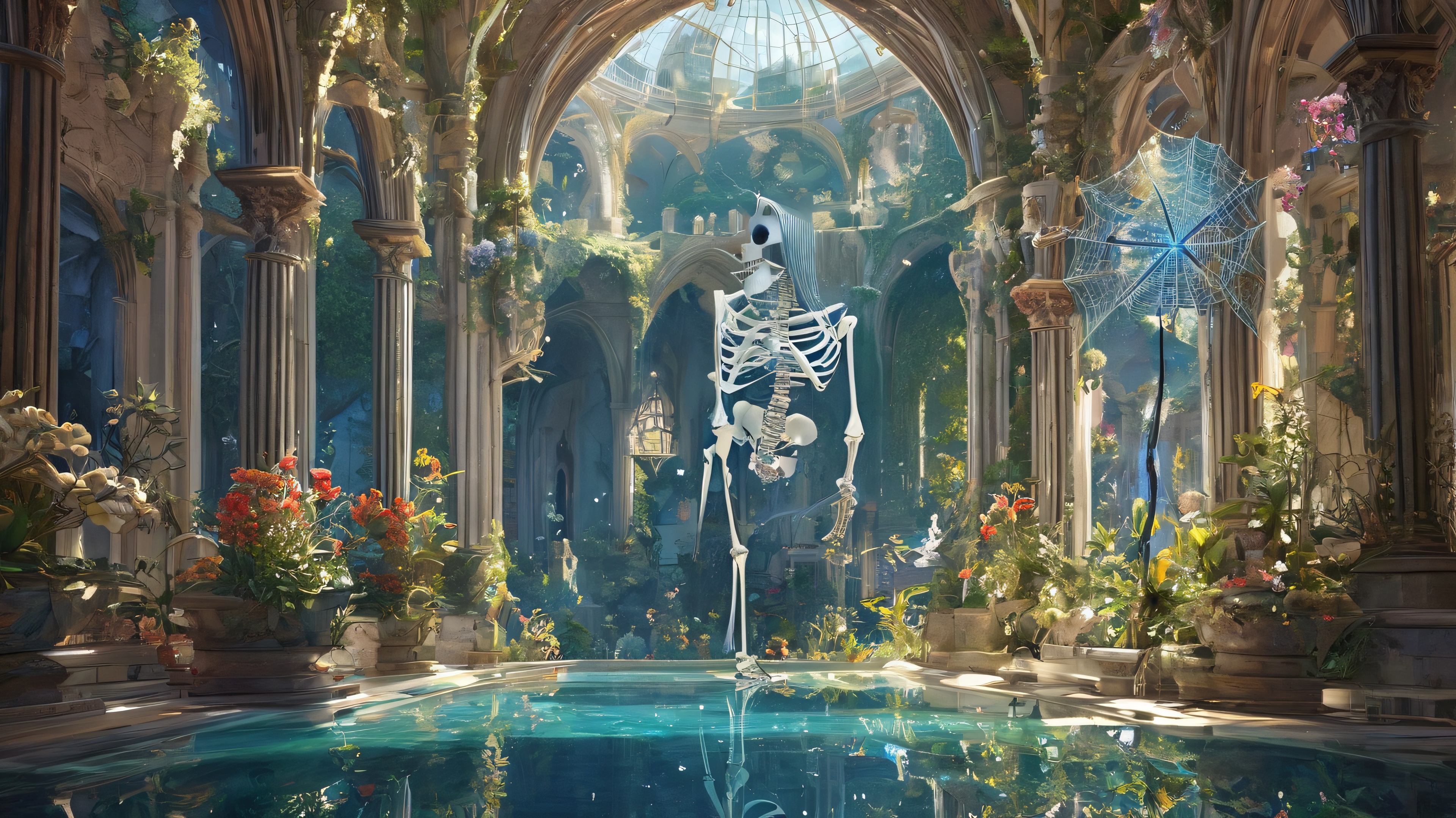 A stunning 8K resolution wallpaper featuring an epic, breathtakingly vast pure void with extreme depth of field, scattered cobwebs, and a perfectly centered Civitai AI skeleton. Ethereal lighting illuminates the scene, showcasing radiant brilliant colors and ray-traced reflections. The overall aesthetic is dark yet airy, with a perfect composition and highly textured surfaces.