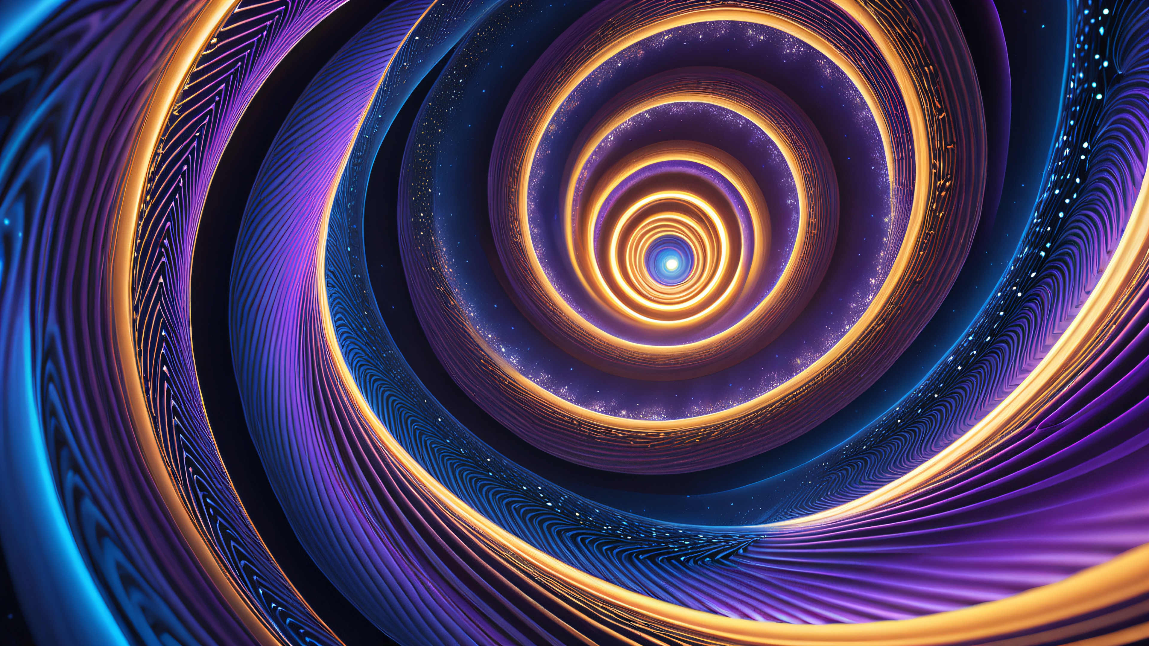 A stunning digital painting depicting a swirling vortex, born from intricate mathematical formulas. The void-like space features a subtle gradient of deep blues and purples, punctuated by faint, pulsing light streaks that evoke the sensation of being suspended within a digital black hole. Cinematic lighting adds depth, with a warm golden glow at the center gradually transitioning to a cool blue-ish hue towards the periphery.