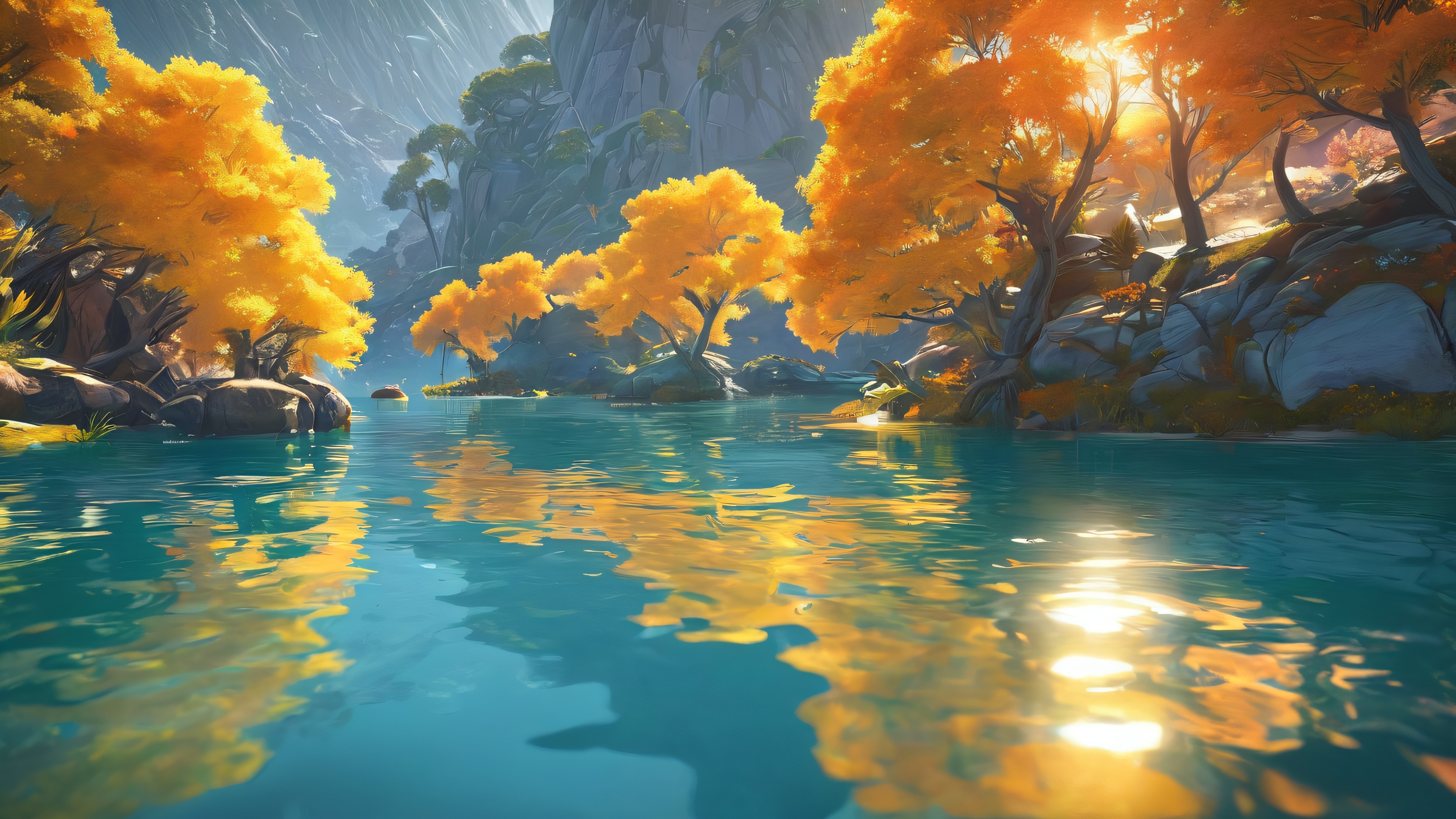 This breathtaking digital art masterpiece features Ellie Williams amidst an extreme depth of field, surrounded by stunning video game-inspired visuals. The radiant sunlight casts a warm glow on the pristine water, creating a serene atmosphere. Muted blues and greens dominate the scene, punctuated by fiery orange and yellow hues, evoking a sense of survival in a desolate environment.