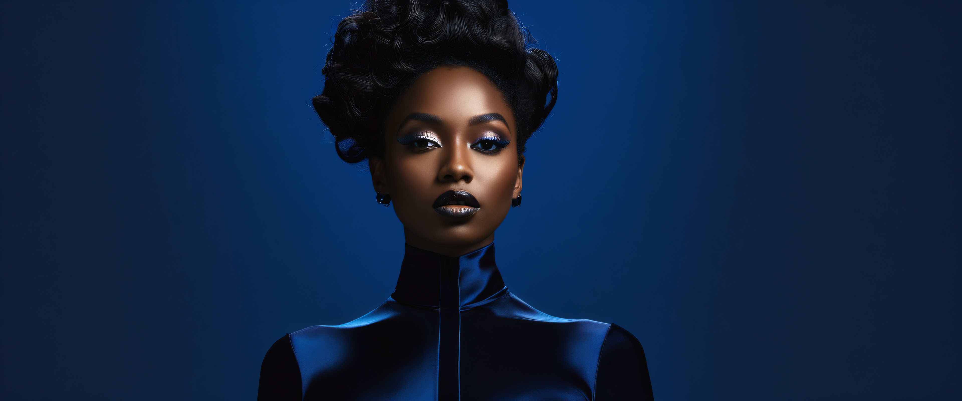 Experience the breathtaking combination of sleek dark mode aesthetic, pristine clarity, and luminescent accents in this stunning digital artwork. Witness the majestic woman standing out against the deep perfect blacks and striking contrast, surrounded by intricate textures and micro-details that evoke a sense of depth and dimensionality.