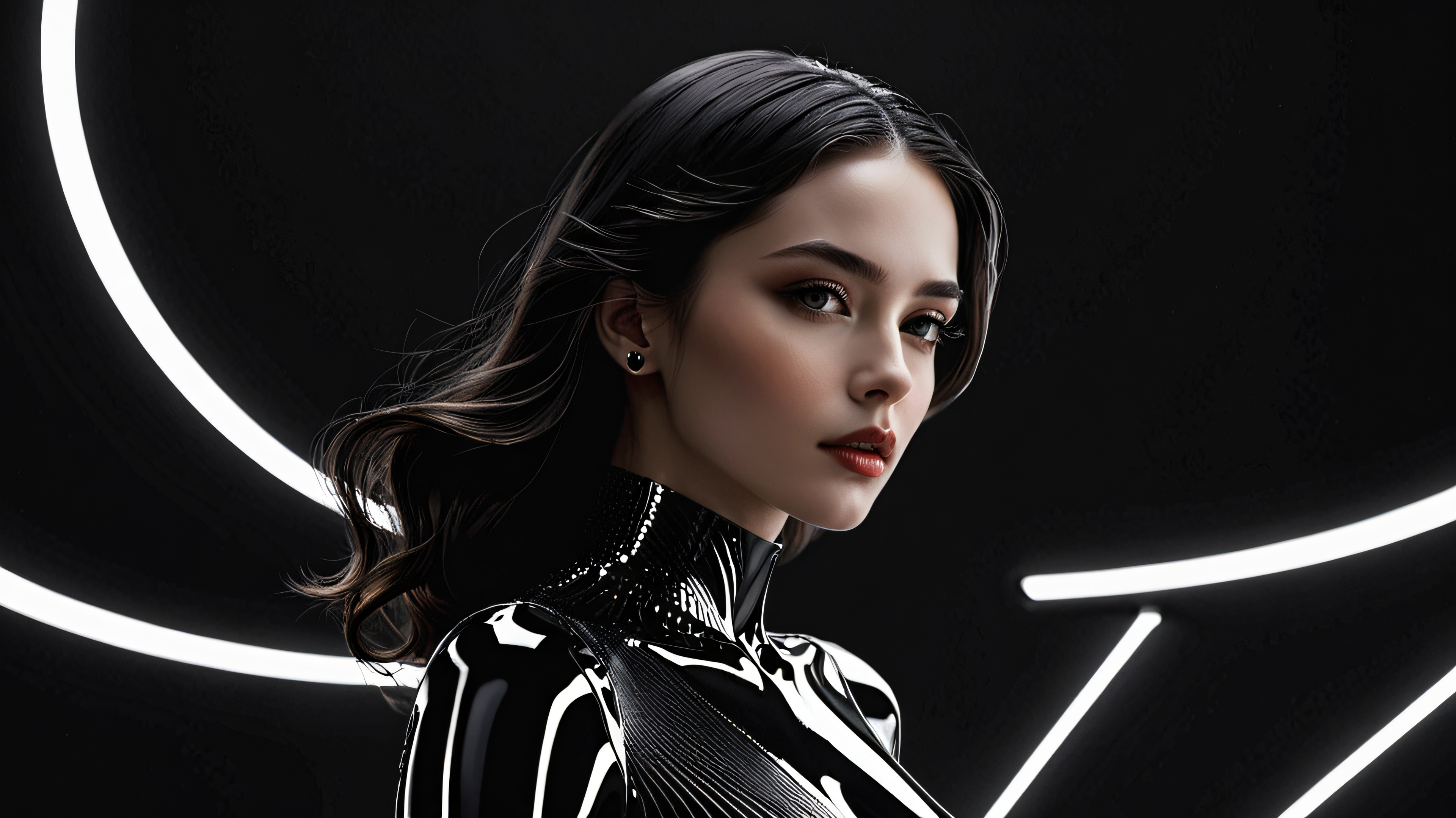 This breathtaking 8K wallpaper features an exquisite, award-winning digital art piece showcasing a woman suspended in a stunningly rendered, 原始的な空白. The extreme depth of field creates a sense of intimate connection with the subject, while the sleek dark mode aesthetic is characterized by deep perfect blacks, 印象的なコントラスト, エレガントな発光アクセント. The result is a visually arresting masterpiece that exudes elegance, sophistication, and a deep sense of visual impact.