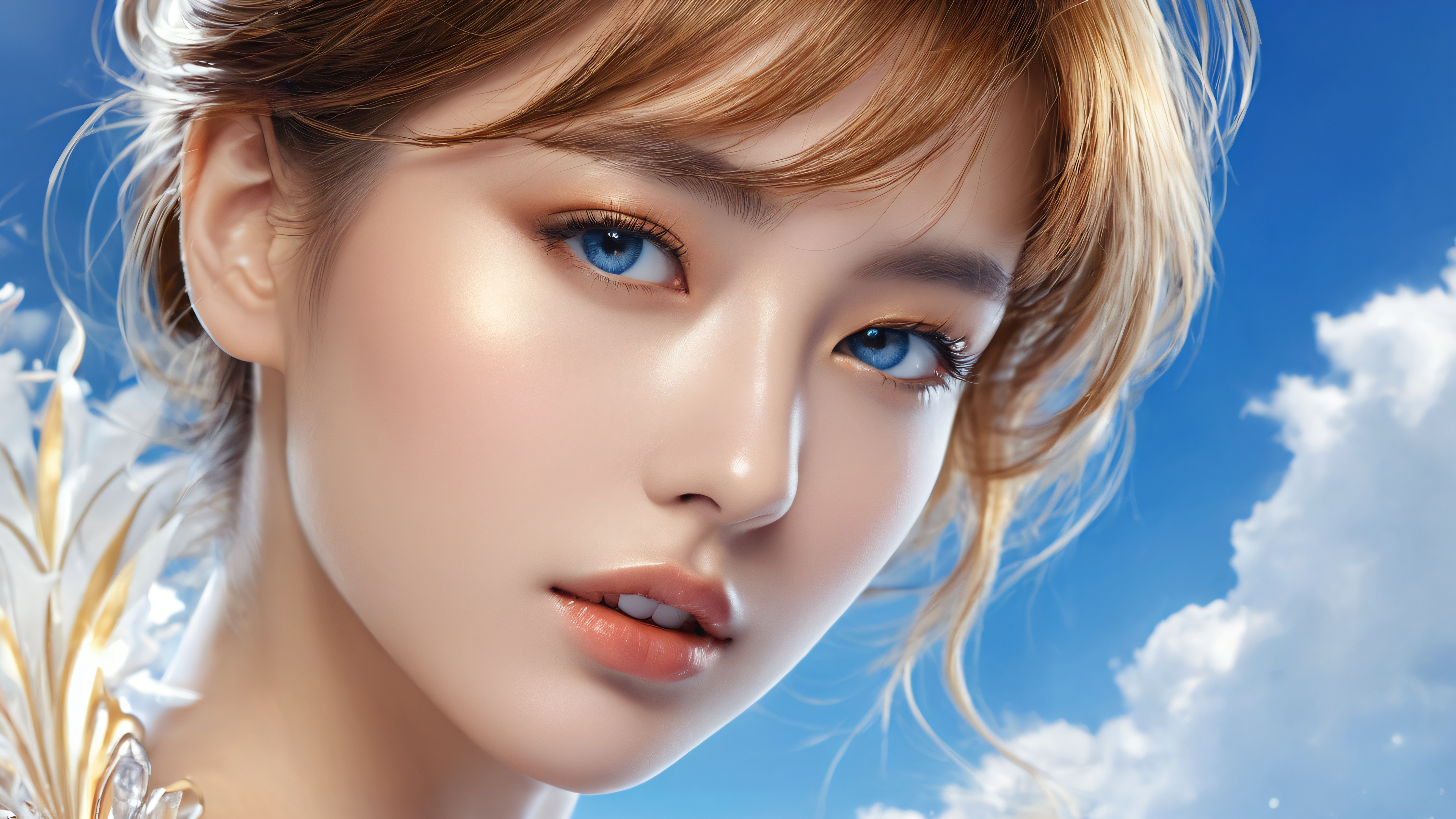 A breathtaking desktop wallpaper of Portrait, perfectly clean vast pure void, 極端な被写界深度, 受賞歴のあるデジタルアート, 原始的な透明度, ETHEREAL LIGHTING. 輝く, 鮮やかな色, レイトレースされた反射, そして純粋な透明感. 明るく風通しが良い。, [‘Golden Brown’, ‘Deep Blue’], 16:9 アスペクト比, 幻想的な照明, 輝く, 鮮やかな色, レイトレースされた反射, 原始的な透明度, 受賞歴のあるデジタルアート, 息を呑むような壮大なスケール, 見事な視覚的インパクト, 完璧な構成, 高度にテクスチャーのある表面, 複雑な微細なディテール, 物理ベースのレンダリング, macOSの壁紙の美しさ, 傑作, 最高品質, 非常に詳細な, 8k解像度.