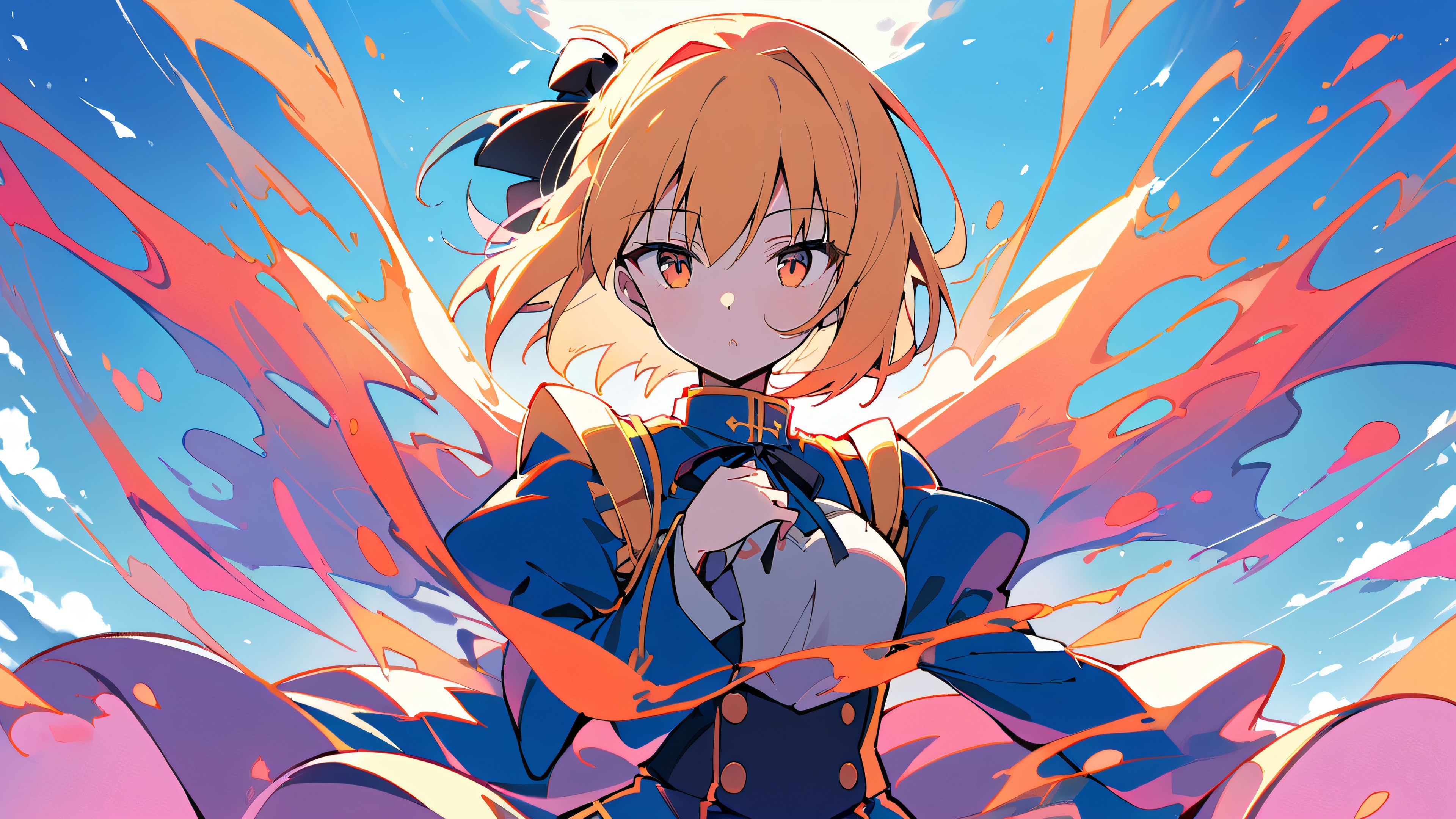 This stunning 16:9 wallpaper features a captivating anime girl standing solo against a breathtakingly bright and airy sky, illuminated by cinematic lighting that accentuates her vibrant orange and pink attire. The soft peach hues in her surroundings add to the serene ambiance, making this an ideal choice for anyone seeking a highly detailed and visually appealing desktop backdrop.