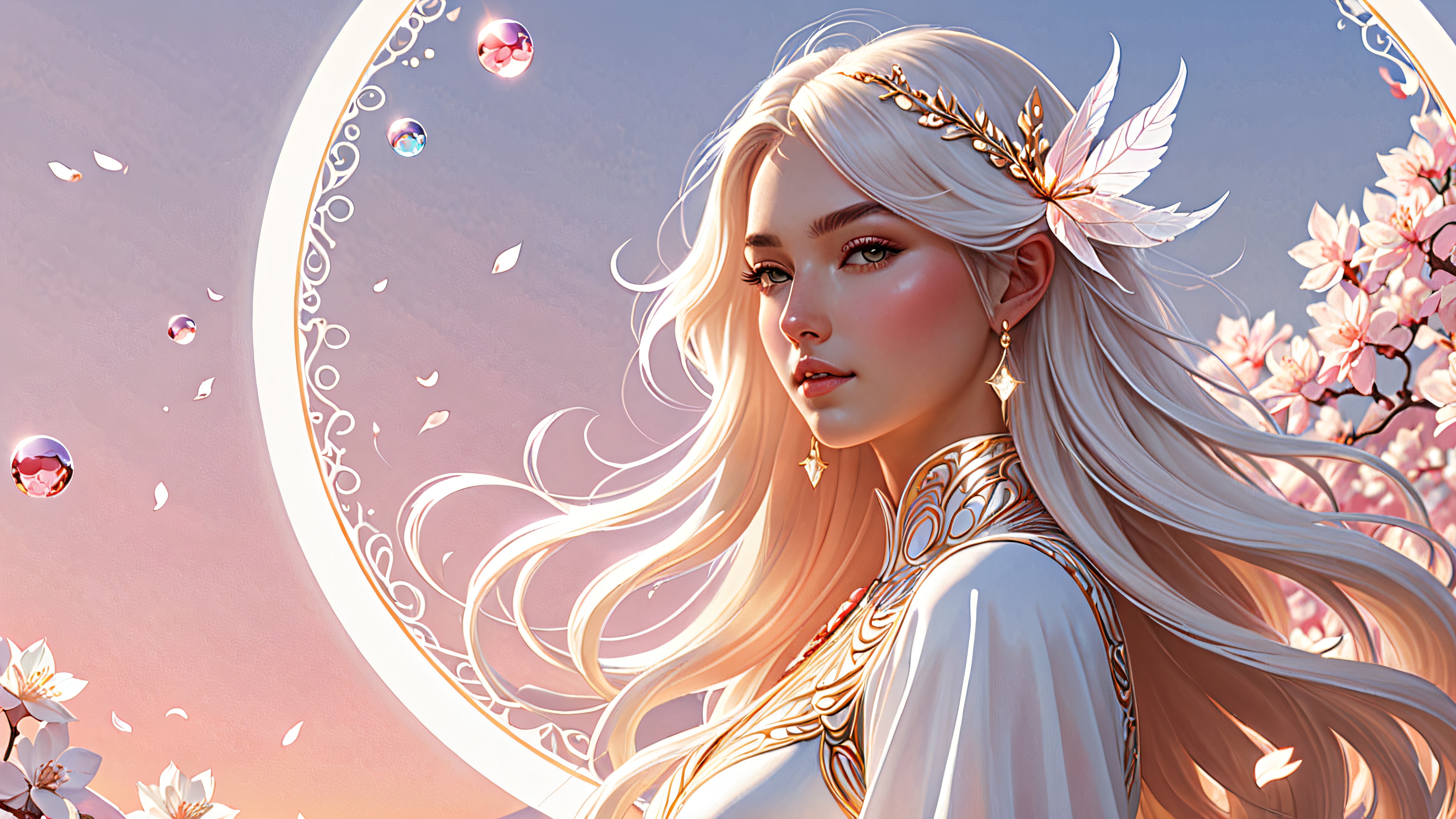 This breathtaking digital art piece features an exquisite illustration of a woman with long hair and intricate details. The scene is bathed in gentle lighting that accentuates her silhouette, while the circular elements add depth and visual interest. The wallpaper’s pristine clarity and ray-traced reflections create a truly radiant and brilliant color palette.