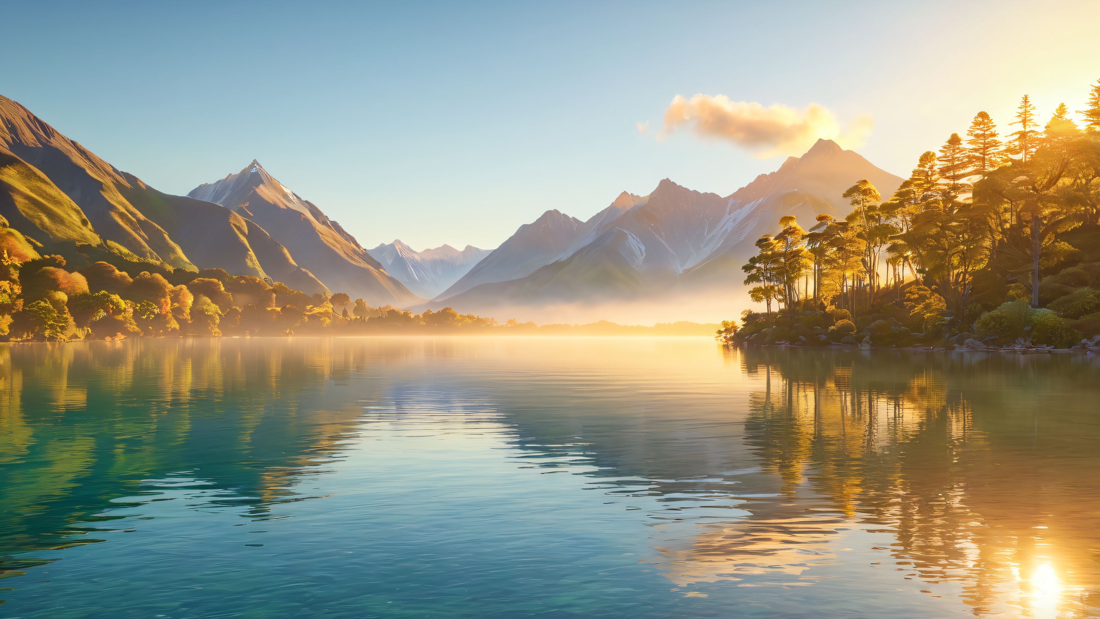 Bask in the warm glow of this stunning 4K desktop wallpaper featuring a tranquil lake surrounded by towering mountains, lush greenery, and deciduous trees. The crystal-clear waters reflect the majestic peaks, while the sun dips low behind them, casting long shadows and a gentle golden light across the lake’s surface.