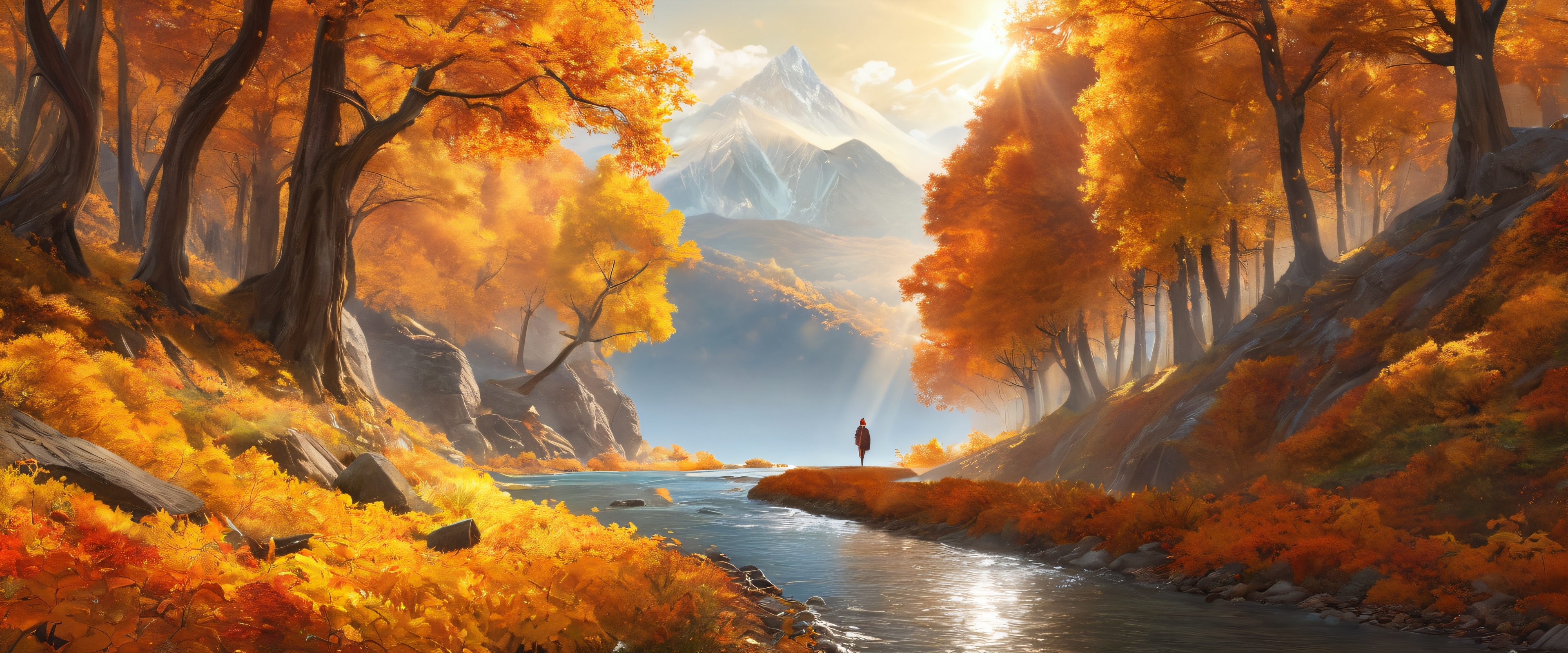 This stunning wallpaper features an epic wide shot of a serene autumnal landscape. A lone figure stands at the edge of a winding mountain road, surrounded by towering trees that reflect perfectly off the still water below. 現場は温かい雰囲気に包まれます, golden light that casts long shadows and illuminates the leaves, water, and the figure itself with ethereal brightness. The color palette is rich and earthy, featuring burnt sienna, golden honey, and soft sage hues that blend seamlessly together.