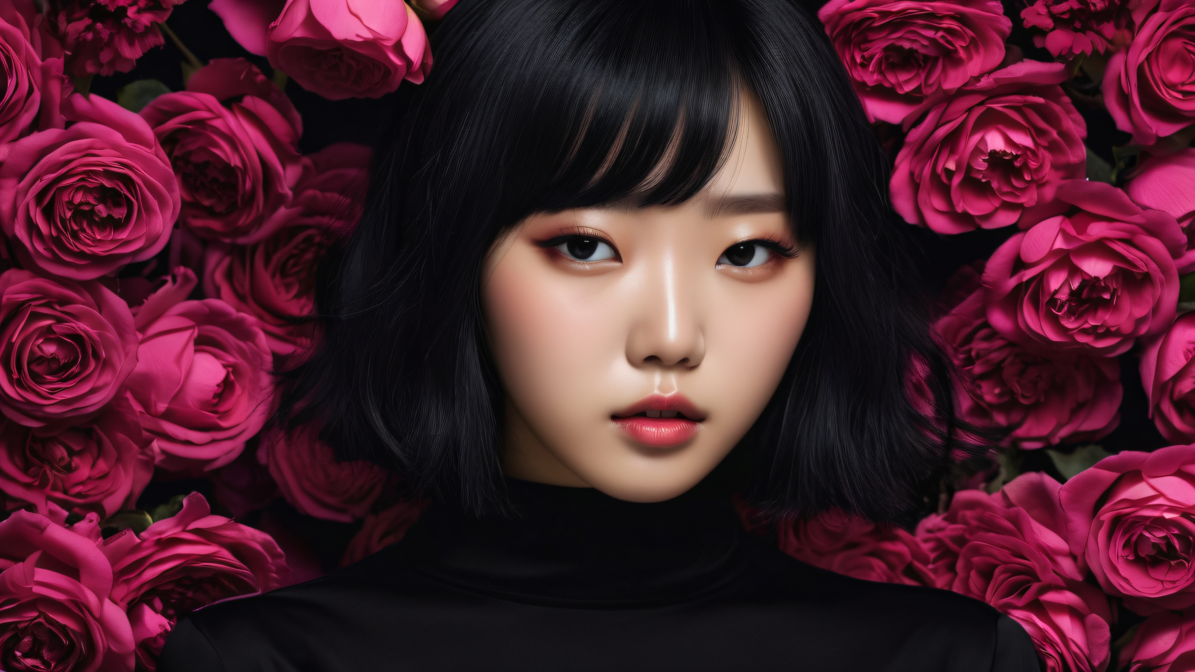 A breathtaking desktop wallpaper of Mad K-pop Idol, perfectly clean vast pure void, extreme depth of field to emphasize the subject’s haunting presence, 受賞歴のあるデジタルアート, pristine clarity with a focus on dark, moody textures and intricate details, SLEEK DARK MODE AESTHETIC: Deep perfect blacks, striking crisp contrast, and elegant luminescent accents to enhance the eerie atmosphere, [‘Deep Pink’, ‘Rich Black’, ‘Elegant Silver’, ‘Dark Rose’], 16:9 アスペクト比, elegant low-key lighting, deep perfect blacks, 印象的なコントラスト, sleek dark mode aesthetic, luminescent accents, deep rich colors, 受賞歴のあるデジタルアート, 息を呑むような壮大なスケール, 見事な視覚的インパクト, 完璧な構成, 高度にテクスチャーのある表面, 複雑な微細なディテール, 物理ベースのレンダリング, macOSの壁紙の美しさ, 傑作, 最高品質, 非常に詳細な, 8k解像度.