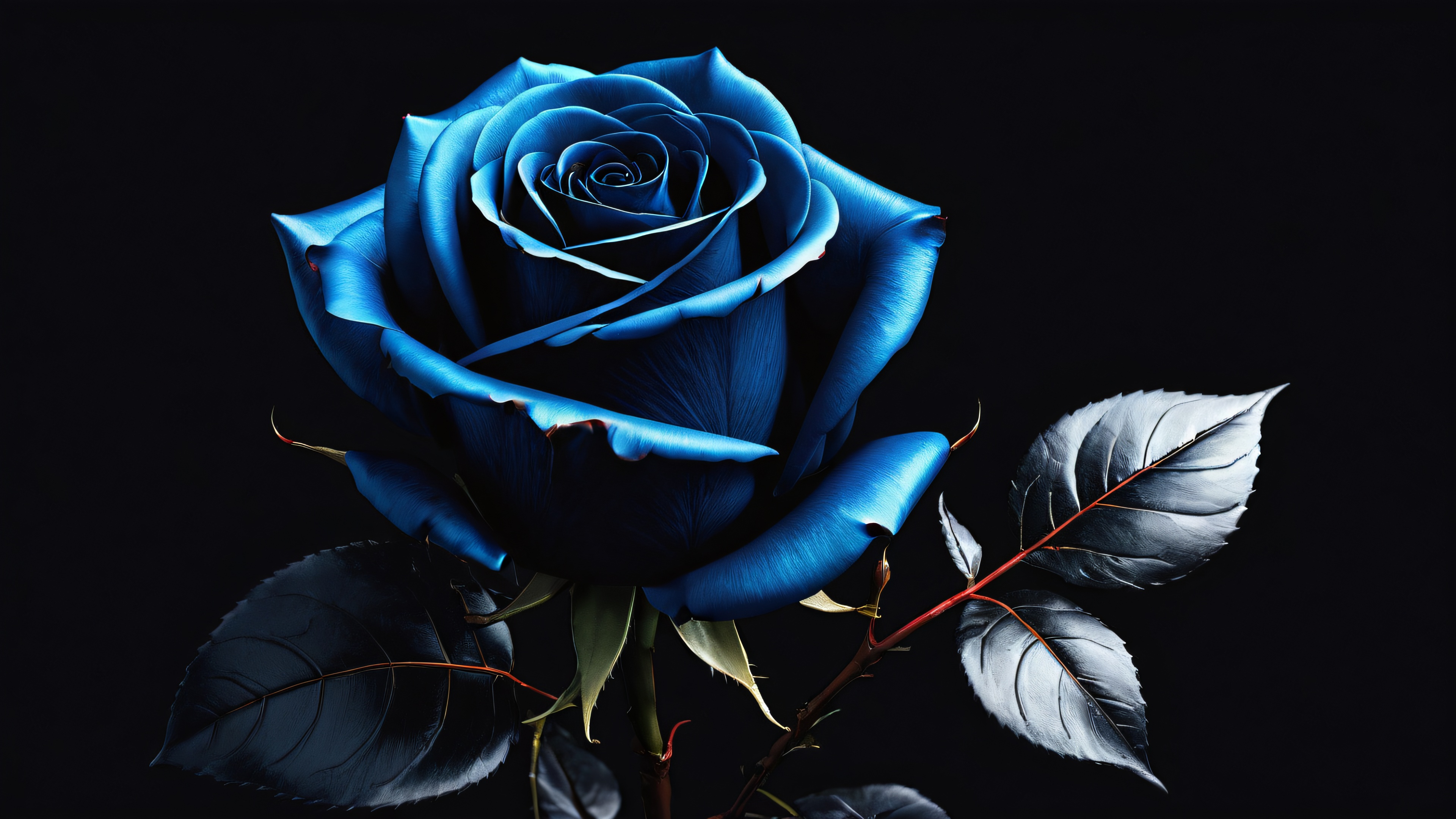 A breathtaking desktop wallpaper of Iron Rose Sentinel, 完璧にきれいな広大な純粋な虚空, 極端な被写界深度, 受賞歴のあるデジタルアート, 原始的な透明度, SLEEK DARK MODE AESTHETIC. Deep perfect blacks, striking crisp contrast, and elegant luminescent accents., Rose and Blue, 16:9 アスペクト比, elegant low-key lighting, deep perfect blacks, 印象的なコントラスト, sleek dark mode aesthetic, luminescent accents, deep rich colors, 受賞歴のあるデジタルアート, 息を呑むような壮大なスケール, 見事な視覚的インパクト, 完璧な構成, 高度にテクスチャーのある表面, 複雑な微細なディテール, 物理ベースのレンダリング, macOSの壁紙の美しさ, 傑作, 最高品質, 非常に詳細な, 8k解像度.