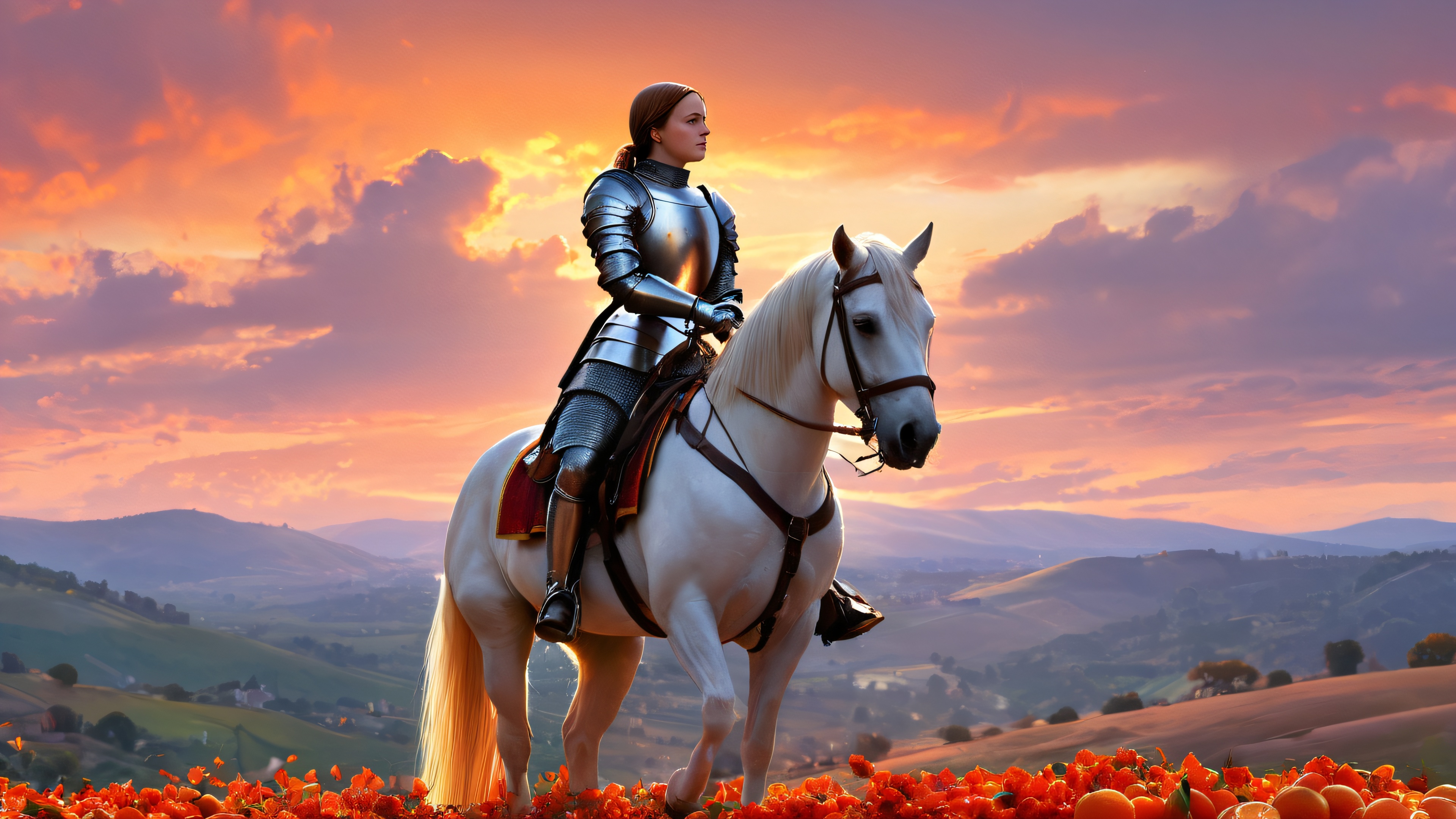 Witness the majesty of Joan of Arc amidst a stunning sunset, where extreme depth of field and ethereal lighting converge. Radiant brilliant colors and ray-traced reflections create a sense of hyper-realism, while pristine clarity and an 8K resolution guarantee a breathtaking visual experience.