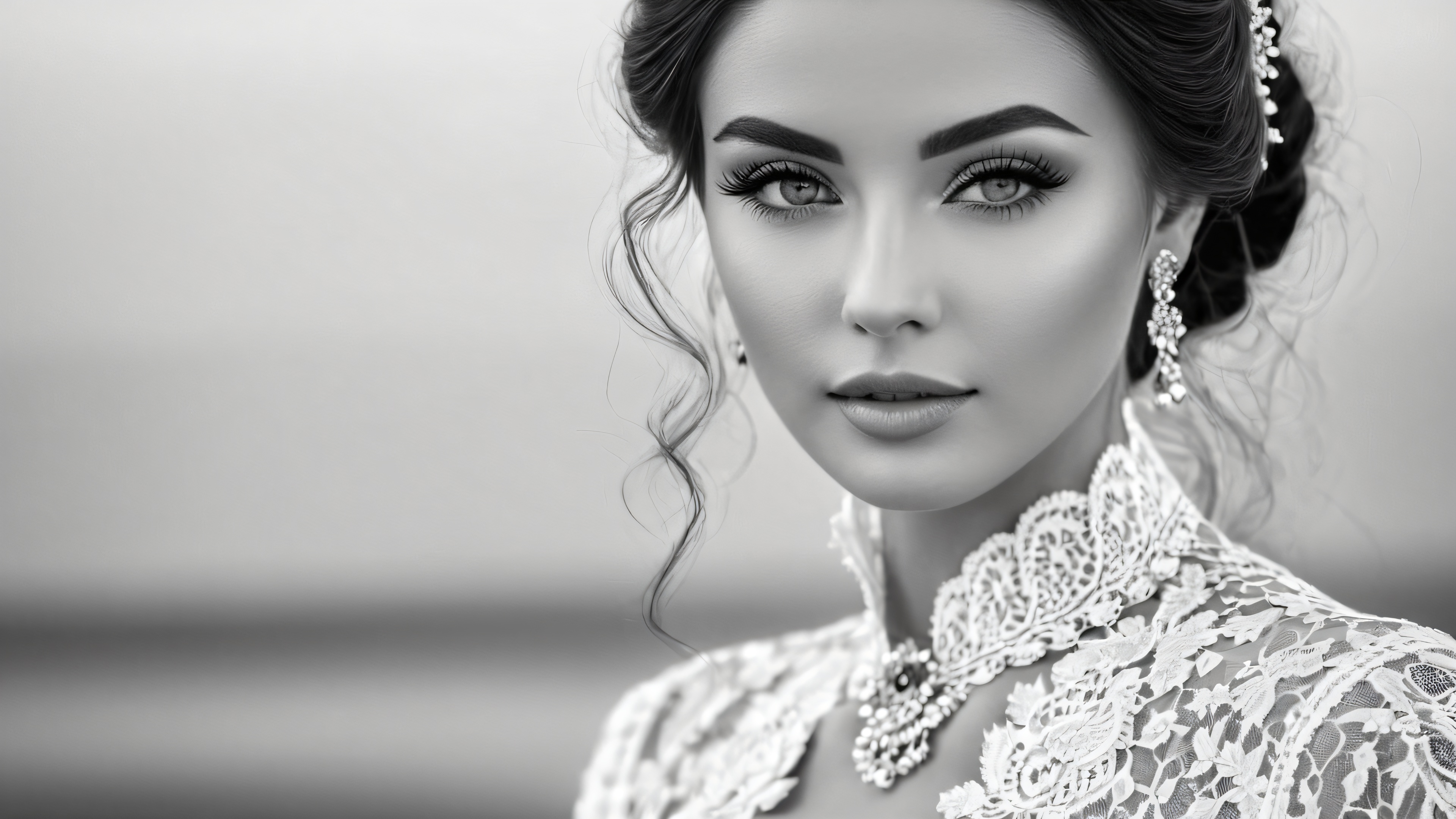 This high-quality desktop wallpaper features a mesmerizing portrait of a woman with a captivating gaze. The monochromatic color palette is complemented by delicate lace details that add texture and visual interest to the scene. The subject’s eyes seem to draw you in, inviting you to step into her world.