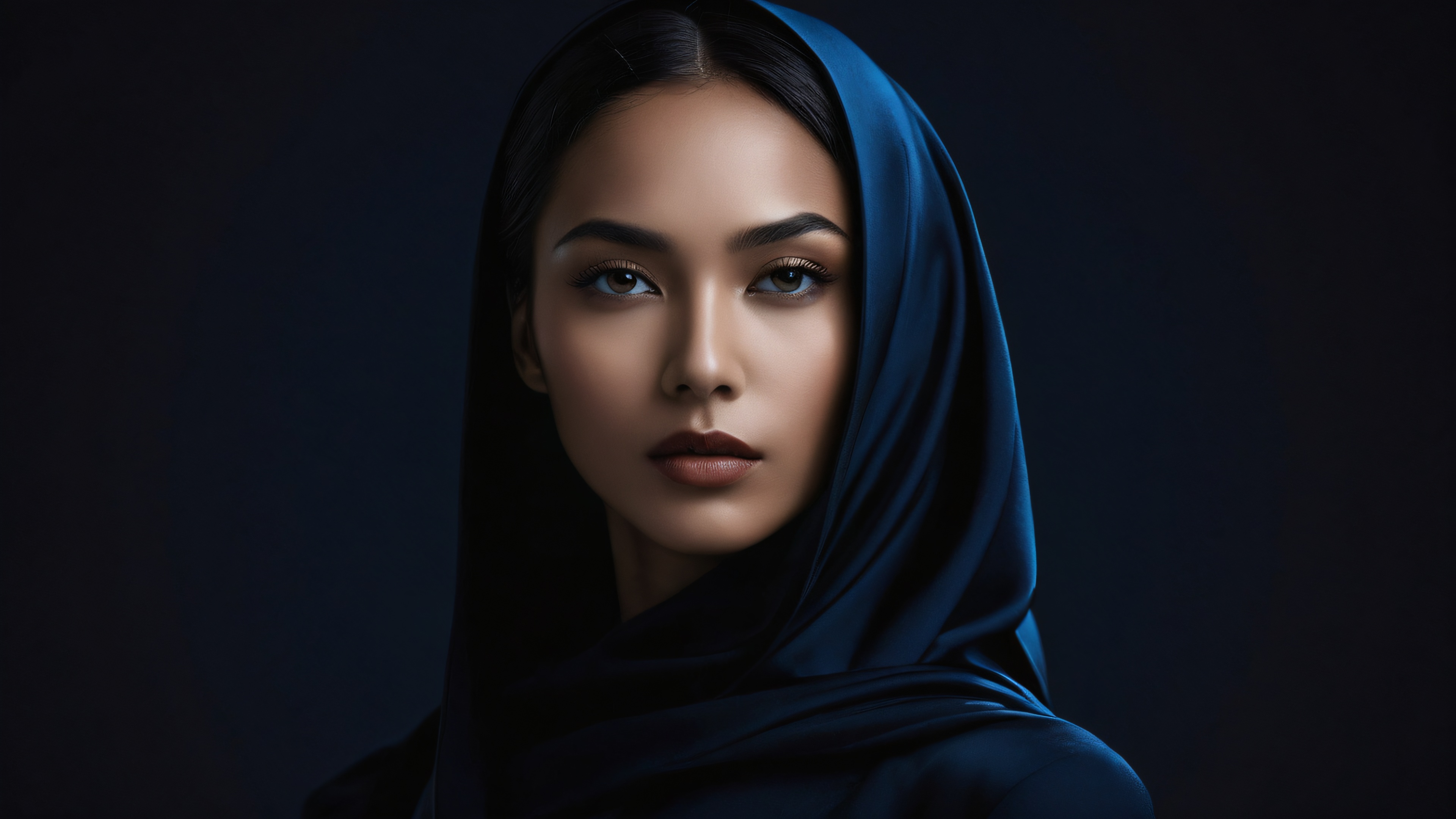 A breathtaking desktop wallpaper of Portrait of a Woman, 完璧にきれいな広大な純粋な虚空, 極端な被写界深度, 受賞歴のあるデジタルアート, 原始的な透明度, SLEEK DARK MODE AESTHETIC. Deep perfect blacks, striking crisp contrast, and elegant luminescent accents., {'支配的な': ‘Midnight Blue’}, 16:9 アスペクト比, elegant low-key lighting, deep perfect blacks, 印象的なコントラスト, sleek dark mode aesthetic, luminescent accents, deep rich colors, 受賞歴のあるデジタルアート, 息を呑むような壮大なスケール, 見事な視覚的インパクト, 完璧な構成, 高度にテクスチャーのある表面, 複雑な微細なディテール, 物理ベースのレンダリング, macOSの壁紙の美しさ, 傑作, 最高品質, 非常に詳細な, 8k解像度.