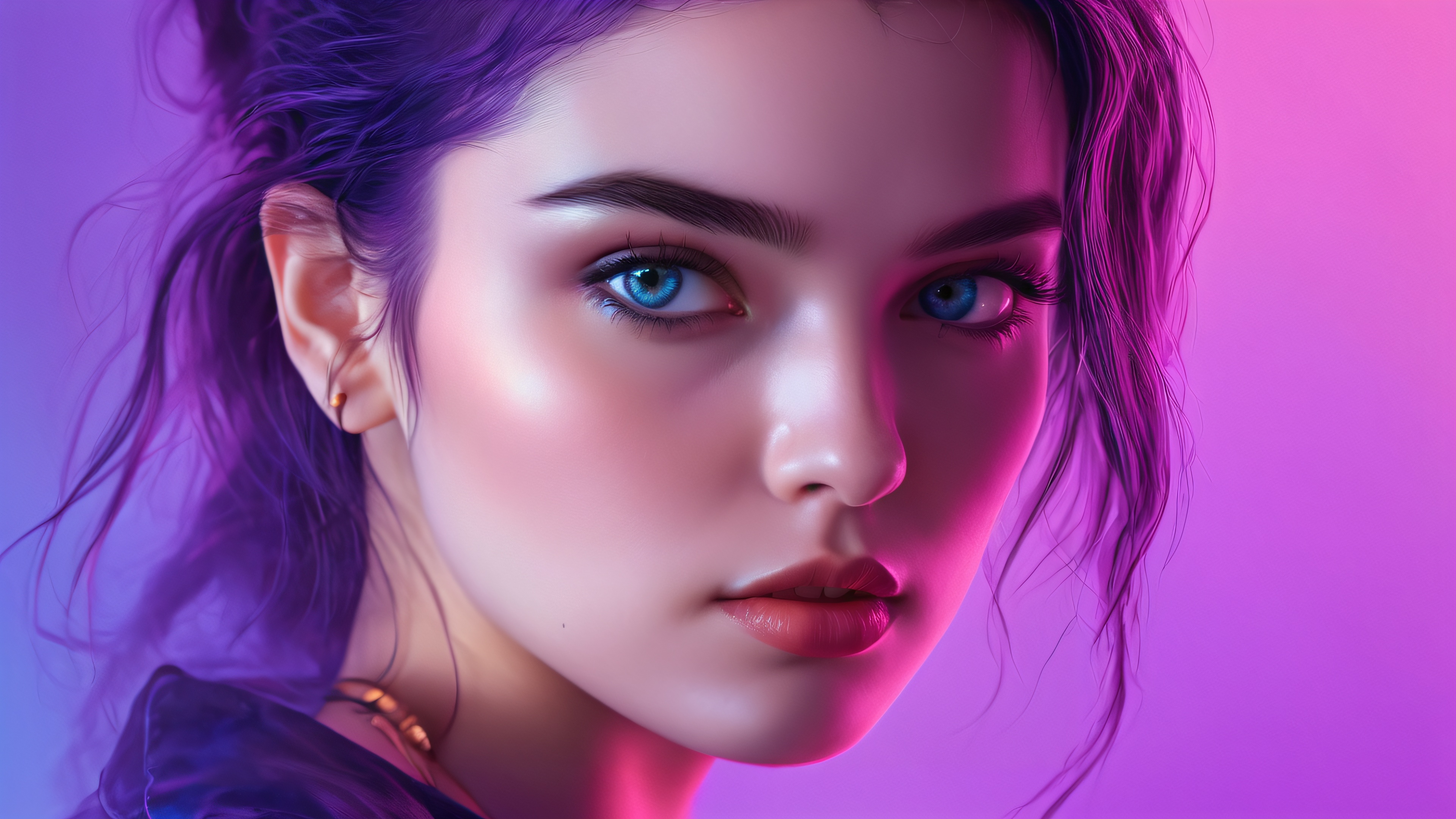 A breathtakingly beautiful digital artwork that transports you to a world of darkness and sentimentality. The dominant dark blues and purples are punctuated by touches of neon, creating an otherworldly ambiance. Portraits of humans and machines mingle in the shadows, their radiant colors and intricate details brought to life through physically based rendering. This masterpiece is perfect for those seeking an epic, visually stunning wallpaper that commands attention.