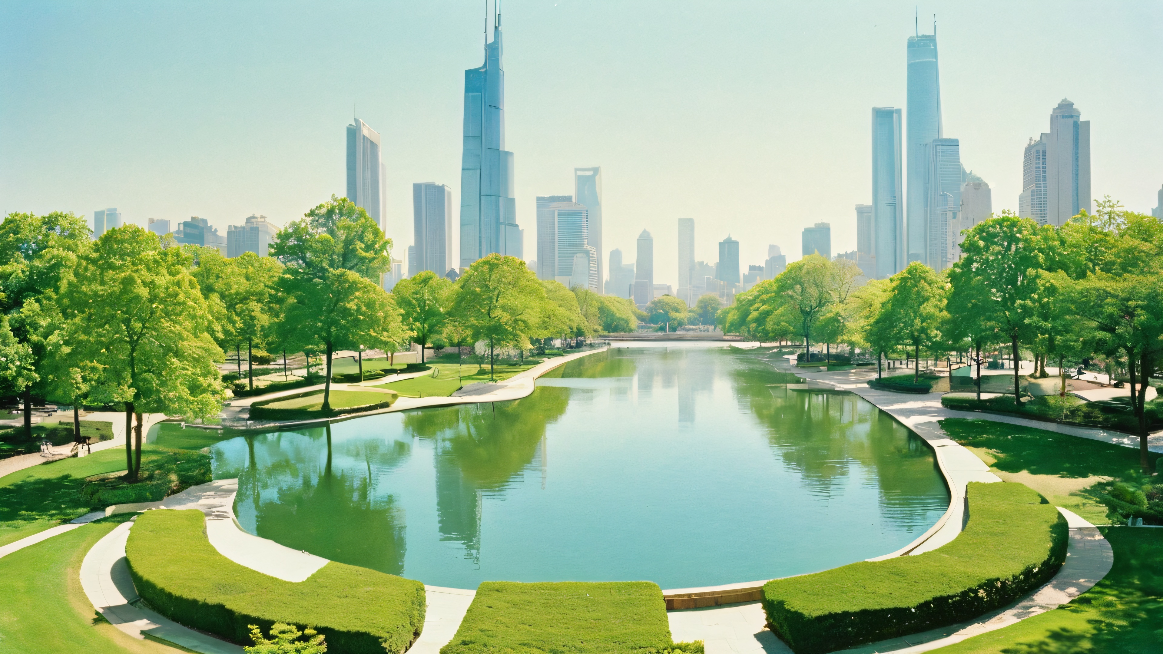 A stunning 16:9 landscape masterpiece that captures the essence of an urban oasis. Lush greenery fills the frame, accompanied by serene water features, winding walking trails and cozy seating areas. The warm sunlight casts a flattering glow on the textured brushstrokes, adding depth and dimension to this breathtaking scene.