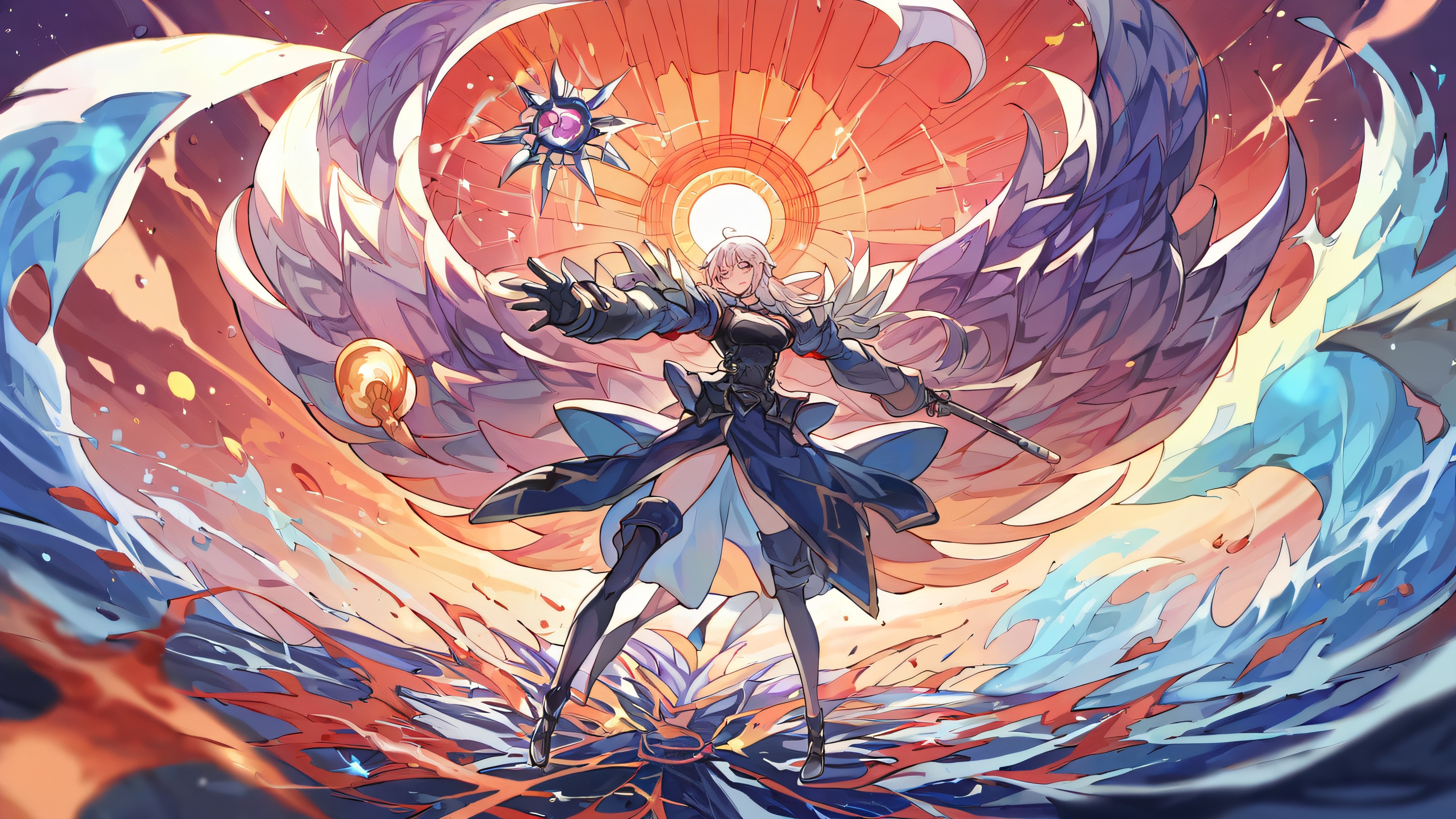 This 8K resolution, 16:9 aspect ratio wallpaper features an ethereal scene of unparalleled beauty. The deep blue void stretches out endlessly, punctuated by vibrant hues that evoke a sense of wonder and awe. A masterpiece of anime illustration awaits, perfectly framed against this stunning backdrop.