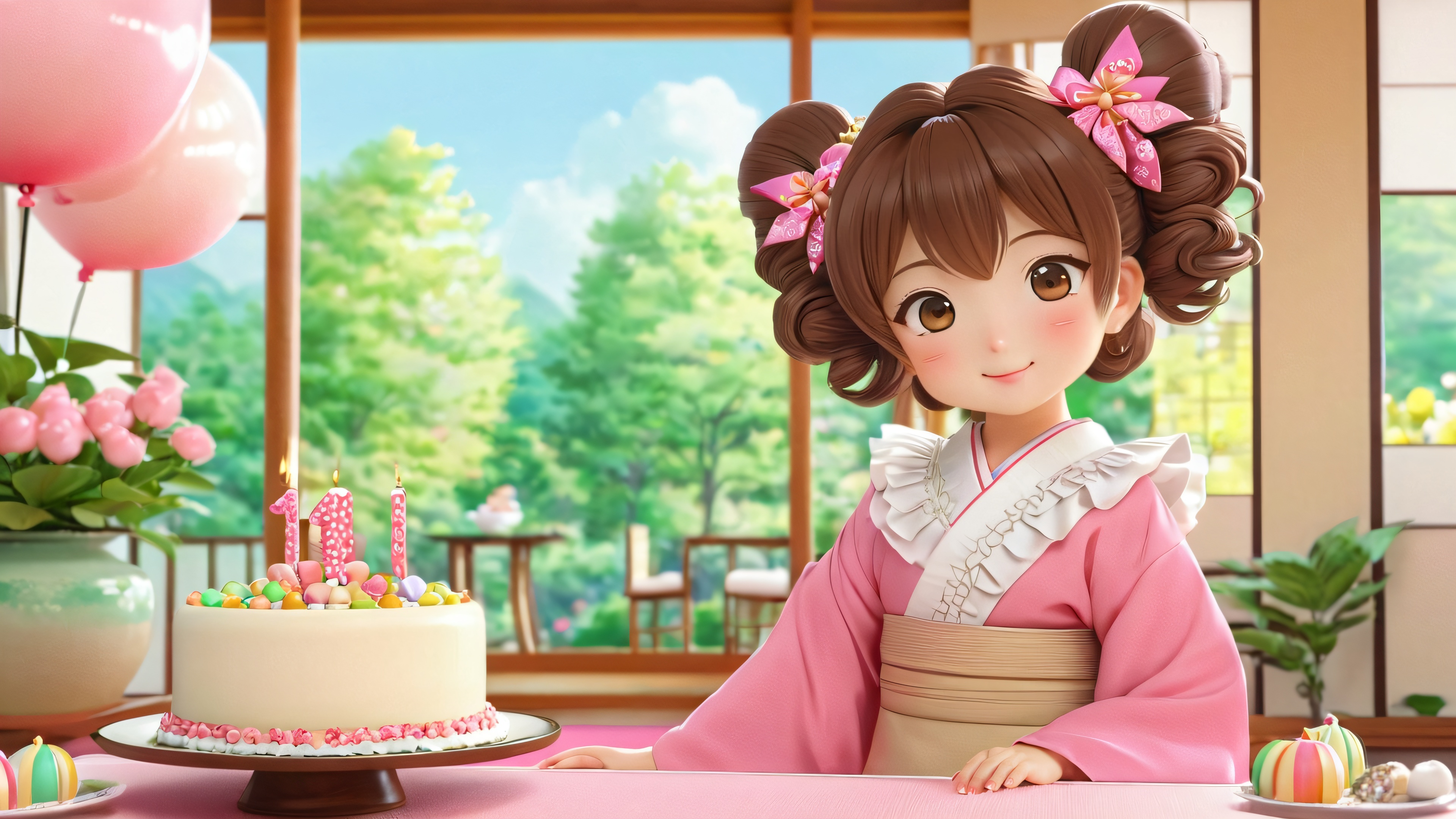 This enchanting 4K wallpaper features Fubuki, a cheerful young girl surrounded by the warmth of a cozy Japanese home. The vibrant pink dress adorned with white ruffles and a matching bow adds a pop of color to the scene. A tiered cake with colorful candies and a ‘Happy Birthday Fubuki’ banner create a festive atmosphere. The room is filled with lush greenery, potted plants with bright flowers, and shoji screens, adding depth and texture to the image.