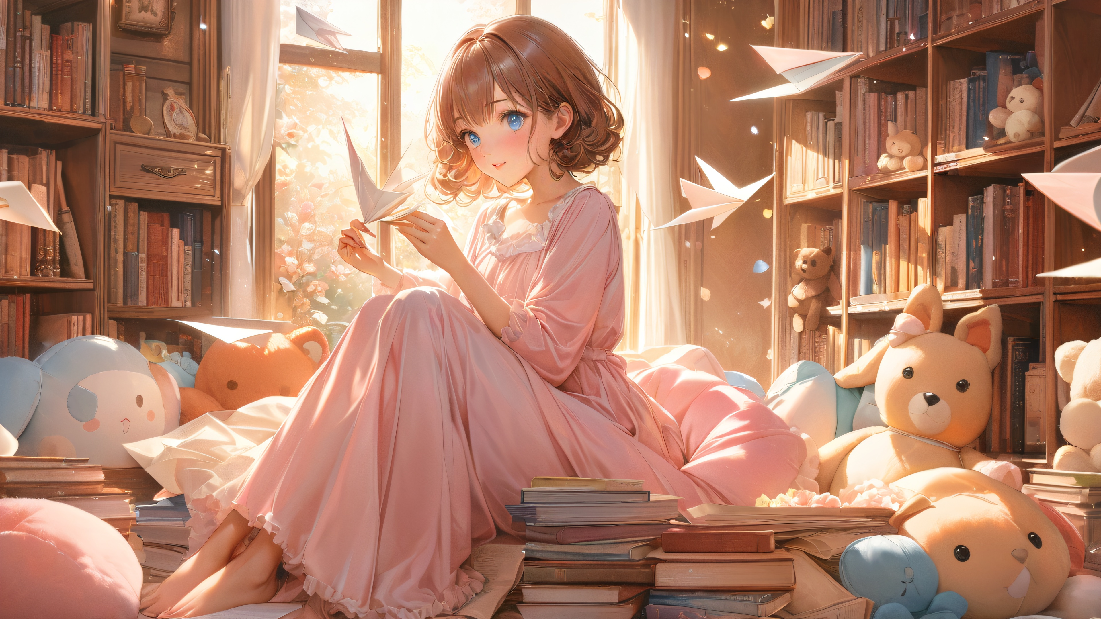 A serene digital painting of a young girl surrounded by vibrant anime-inspired elements. The scene is set in a warm, sunlit room with wooden tones, plush toys, and scattered manga pages. The air is filled with the scent of freshly printed paper, evoking a sense of nostalgia. Delicate origami flowers and fluttering paper airplanes add a touch of whimsy to the cozy atmosphere.