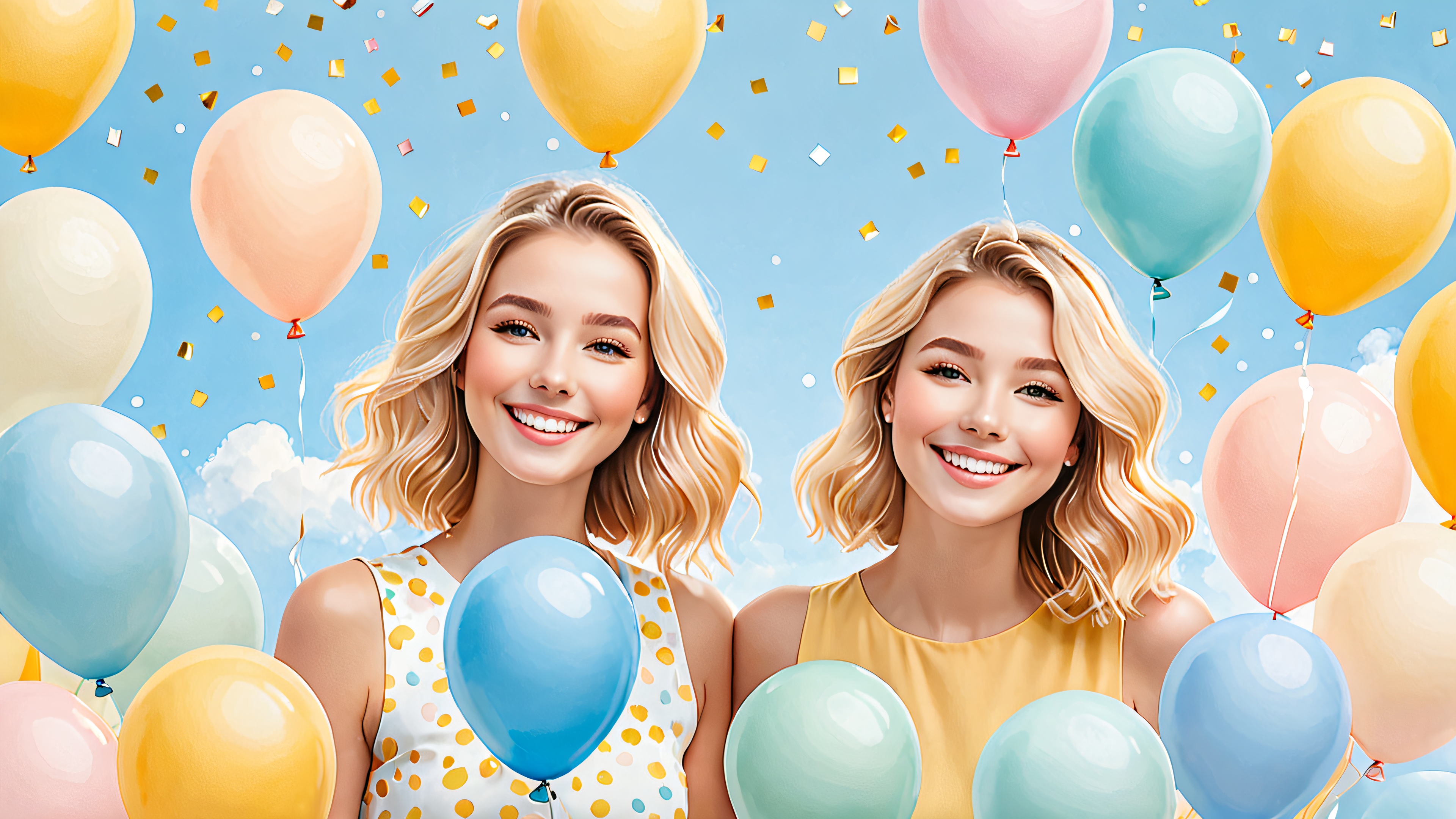 A delightful desktop wallpaper featuring a smiling character amidst fluttering confetti and balloons on a bright, airy space with a pale blue to creamy white gradient background, suitable for Desktop/PC.