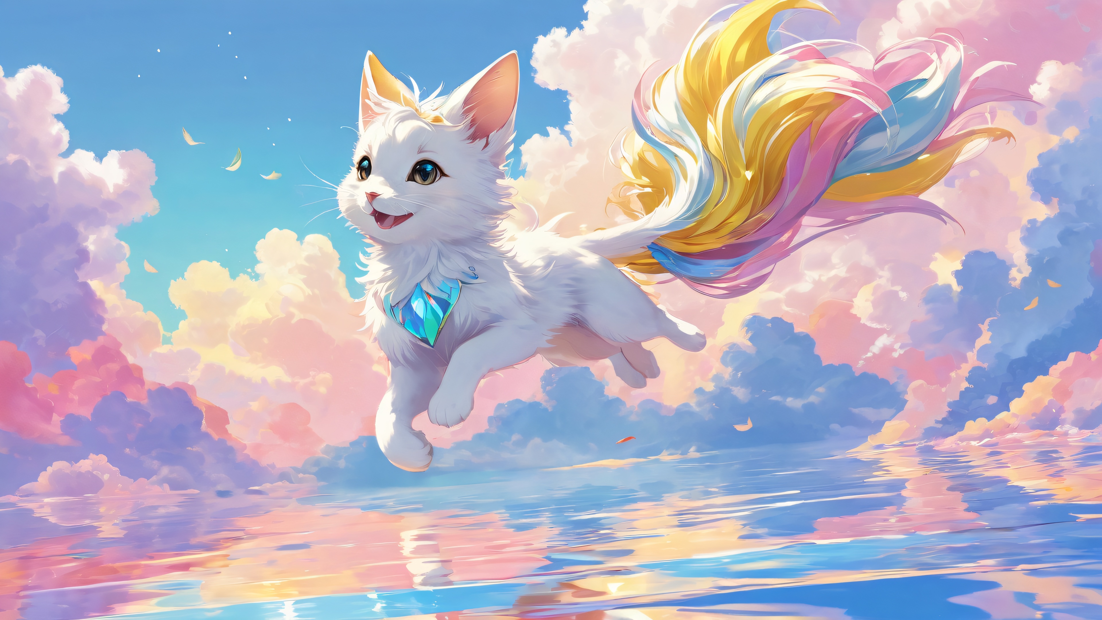 A breathtaking desktop wallpaper of Kirara Jump, perfectly clean vast pure void, extreme depth of field, award-winning digital art, pristine clarity, Ethereal Lighting: Radiant, brilliant colors, ray traced reflections, and pristine clarity. Bright and airy., Dominant Color Palette: A blend of soft pastels with touches of bright, bold hues, 16:9 aspect ratio, ethereal lighting, radiant, brilliant colors, ray traced reflections, pristine clarity, award-winning digital art, epic breathtaking scale, stunning visual impact, perfect composition, highly textured surfaces, intricate micro-details, physically based rendering, macOS wallpaper aesthetic, masterpiece, highest quality, highly detailed, 8k resolution.