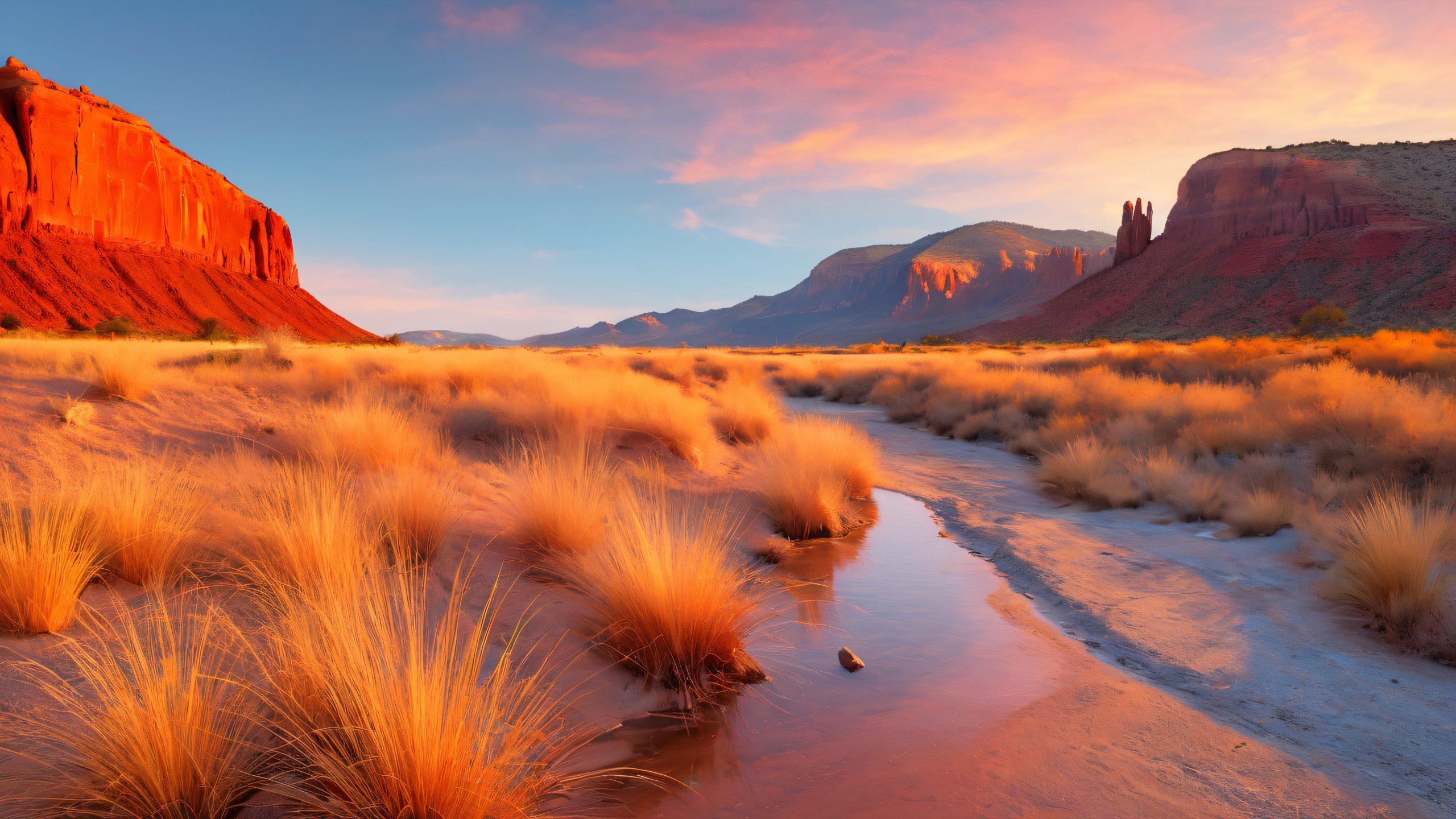 This breathtaking 4K desktop wallpaper depicts La Llorona, the Weeping Woman, standing alone at the edge of a desolate riverbed at sunset. The setting sun casts a warm, golden light across the rust-red rock formations, golden grasses, and dusty riverbed. The ghostly apparition of La Llorona is bathed in a soft, eerie blue light, evoking a sense of nostalgia and mystery. The palette features muted, earthy tones with shades of red, orange, and golden brown, punctuated by deep blues and purples.