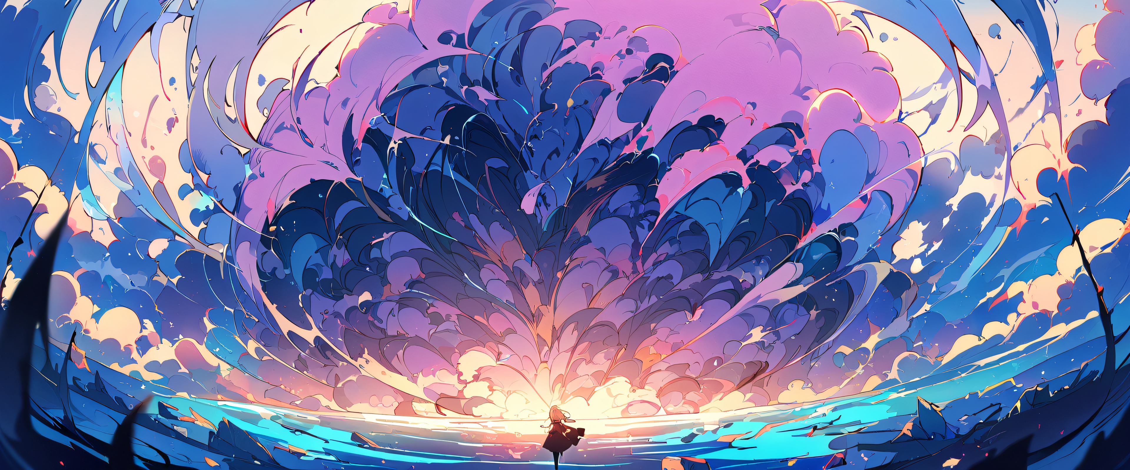 1girl, violet evergarden, violet evergarden, solo, masterpiece, best quality, very aesthetic, absurdres, highly detailed, looking at viewer, Perfectly clean vast pure void, extreme depth of field, with subtle hints of wires and retro computers in the background., Dominant palette of calming blues and whites, reminiscent of Lain’s introspective nature and the void-like environment., 21:9 ultrawide panoramic aspect ratio, epic wide shot, bright and airy, ethereal lighting, beautiful sky, cinematic lighting, vivid colors