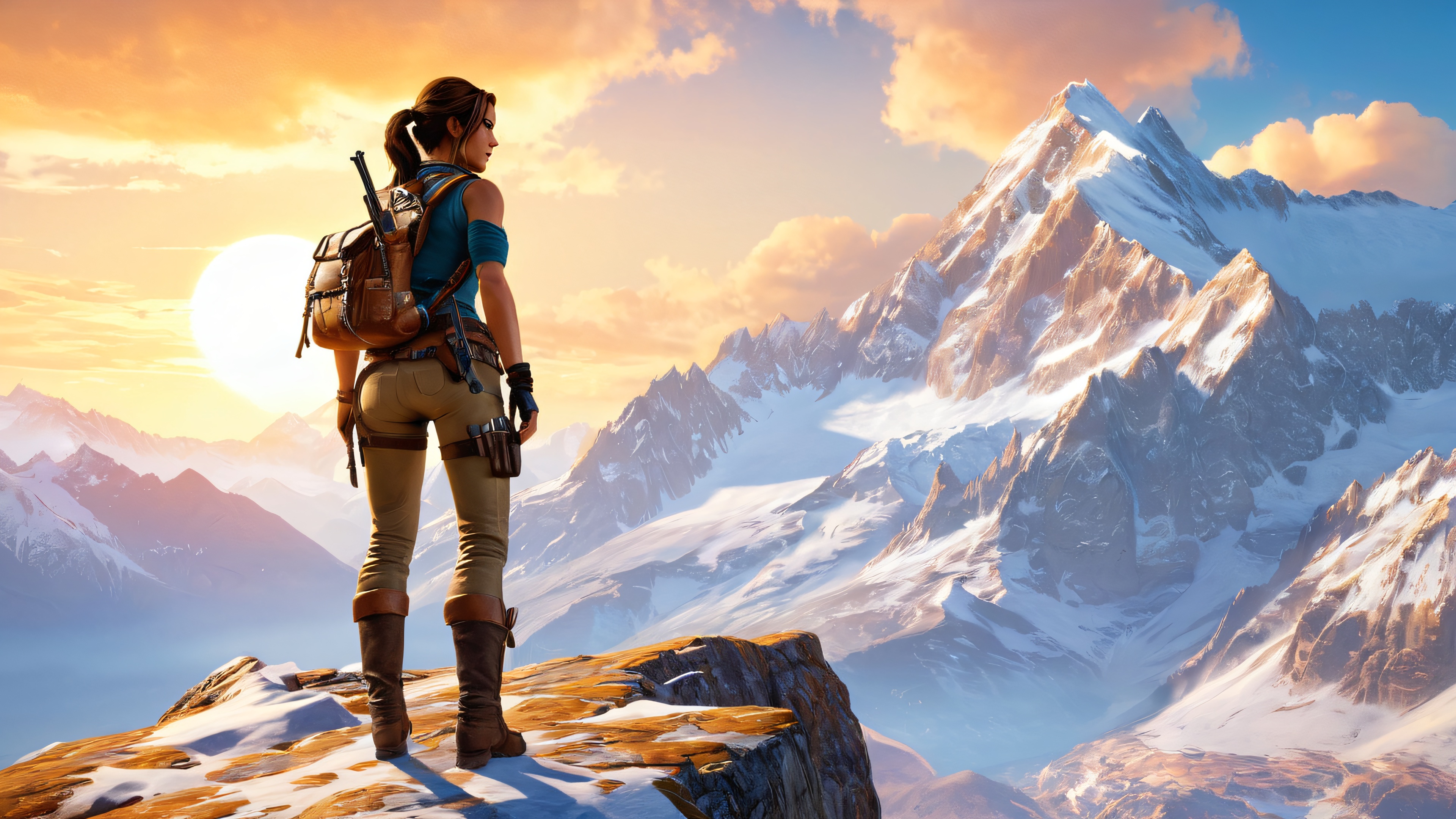 Lara Croft stands at the edge of a treacherous cliff, gazing out at a vast, snow-capped mountain range bathed in the warm, golden light of a setting sun.