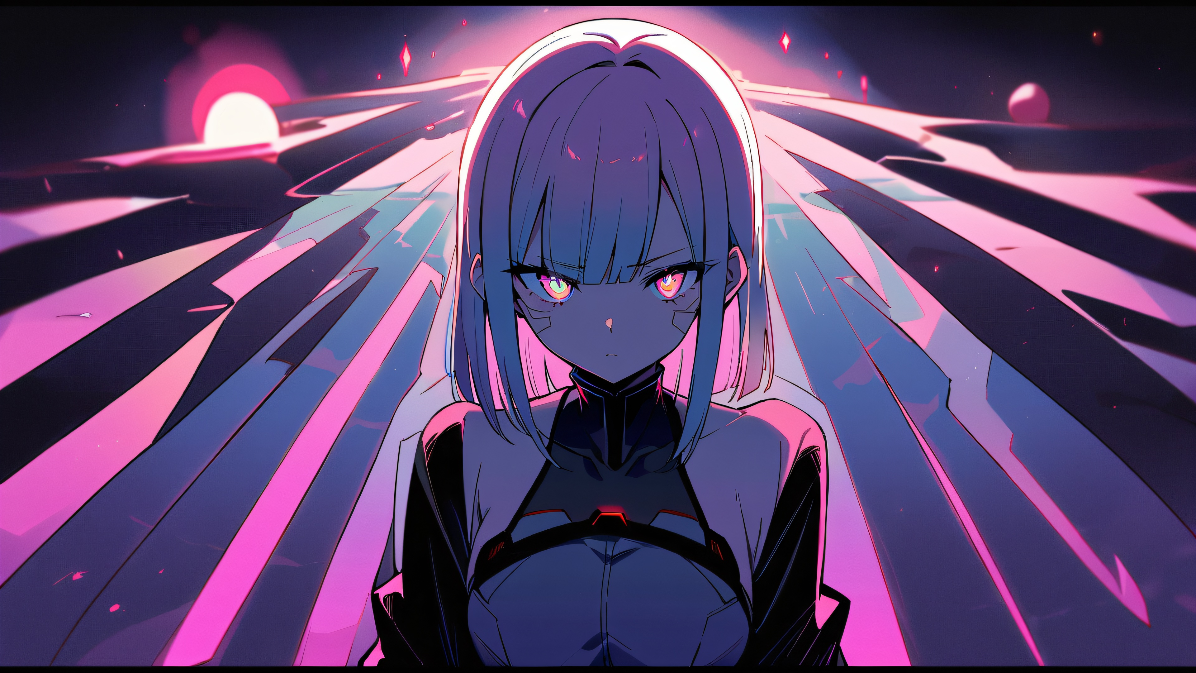 1girl, lucy, cyberpunk edgerunners, solo, masterpiece, best quality, very aesthetic, absurdres, highly detailed, looking at viewer, perfectly clean vast pure void, extreme depth of field, shallow barren salt flats, desaturated tones, 16:9 aspect ratio, elegant low-key lighting, striking contrast, deep perfect blacks, night scene, glowing lights, dramatic shadows