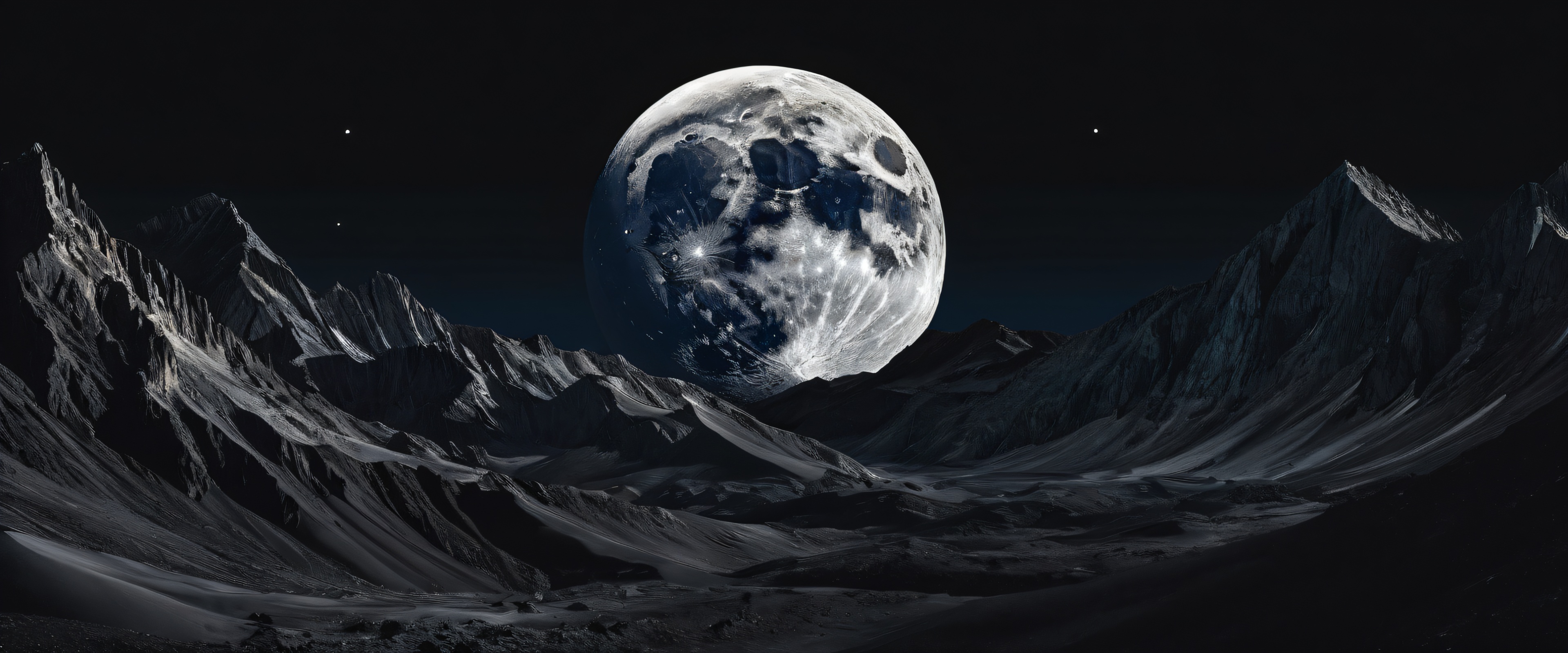 A breathtaking desktop wallpaper of Moon, perfectly clean vast pure void, extreme depth of field, award-winning digital art, pristine clarity, SLEEK DARK MODE AESTHEThetic: Deep perfect blacks, striking crisp contrast, and elegant luminescent accents, Deep blues and grays, 21:9 ultrawide panoramic aspect ratio, epic wide shot, elegant low-key lighting, deep perfect blacks, striking contrast, sleek dark mode aesthetic, luminescent accents, deep rich colors, award-winning digital art, epic breathtaking scale, stunning visual impact, perfect composition, highly textured surfaces, intricate micro-details, physically based rendering, macOS wallpaper aesthetic, masterpiece, highest quality, highly detailed, 8k resolution.