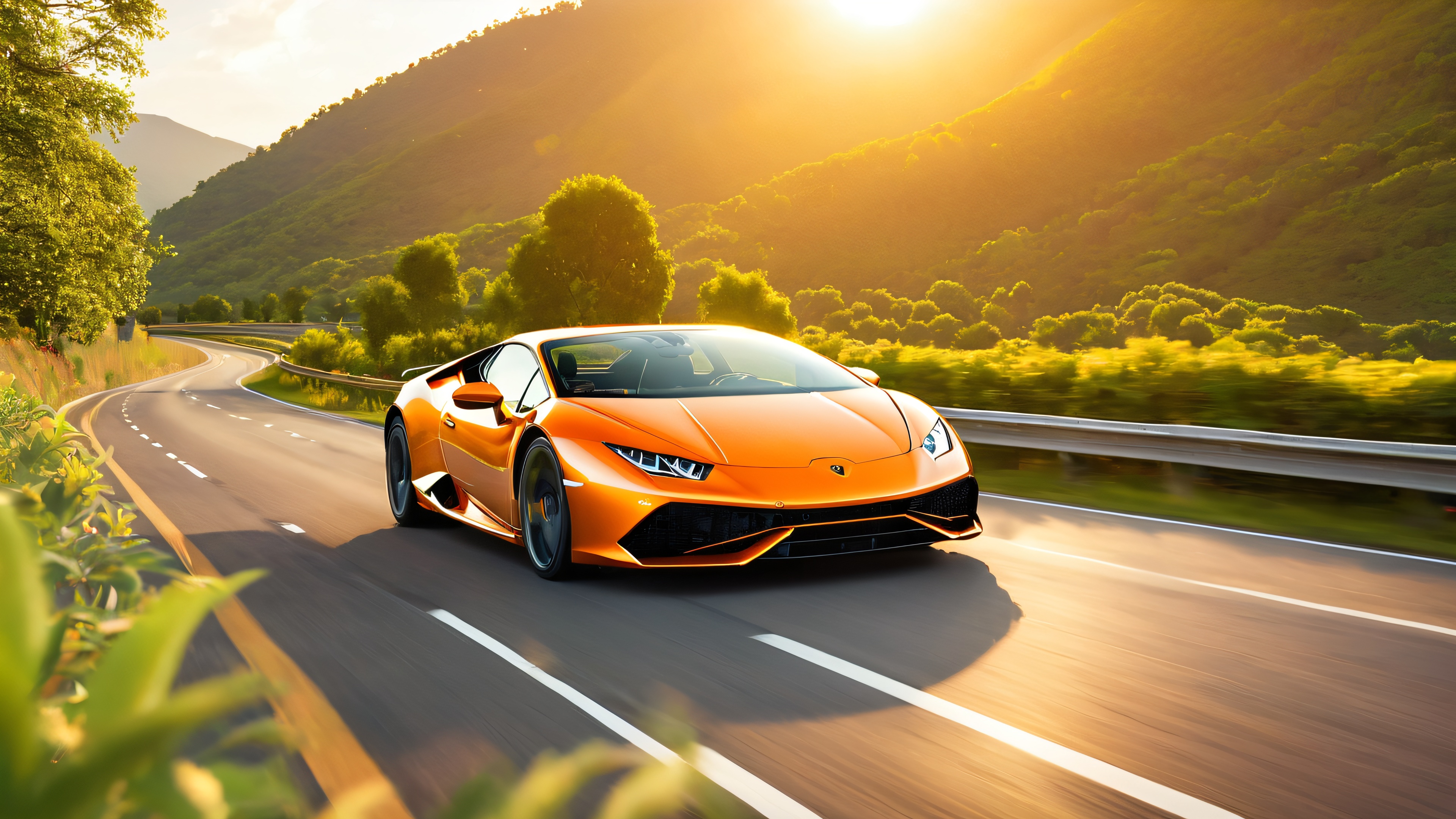 This stunning 4K wallpaper features a Lamborghini Huracán speeding down a picturesque winding road, surrounded by lush greenery and a serene mountainous region. The setting sun casts a warm golden hour glow on the car’s sleek design and the asphalt road, highlighting the attention to detail and textures in the scene. The driver, dressed in stylish attire, grips the wheel with one hand while holding a champagne bottle with the other, celebrating their achievement.