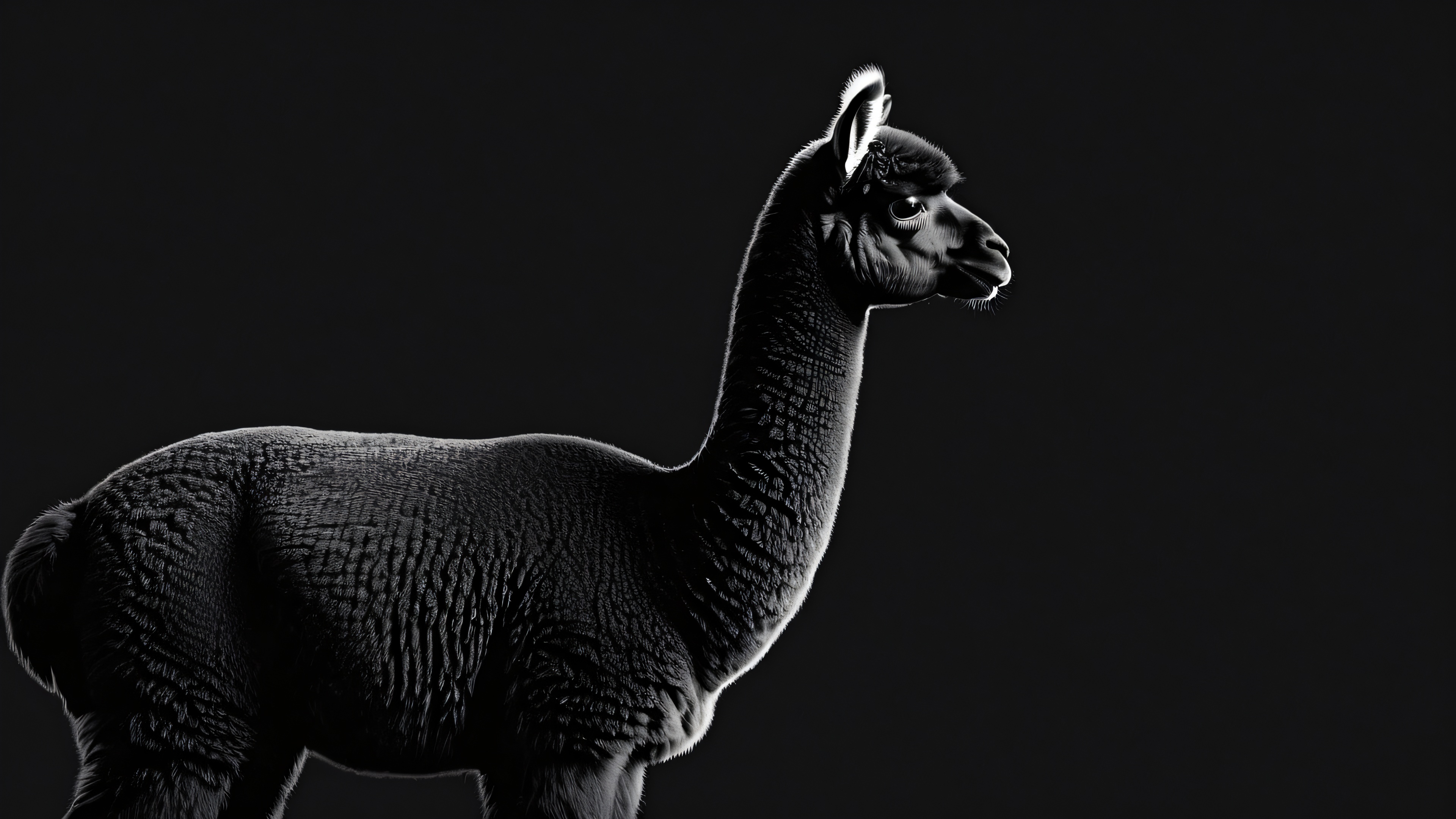 A stunningly detailed digital art piece featuring an majestic alpaca in a sleek dark mode aesthetic. The subject is set against a vast pure void, allowing its intricate features to take center stage. Perfect blacks provide a striking contrast to the elegant luminescent accents, creating a visually stunning impact. With 8k resolution and physically based rendering, this masterpiece boasts highly textured surfaces and intricate micro-details.