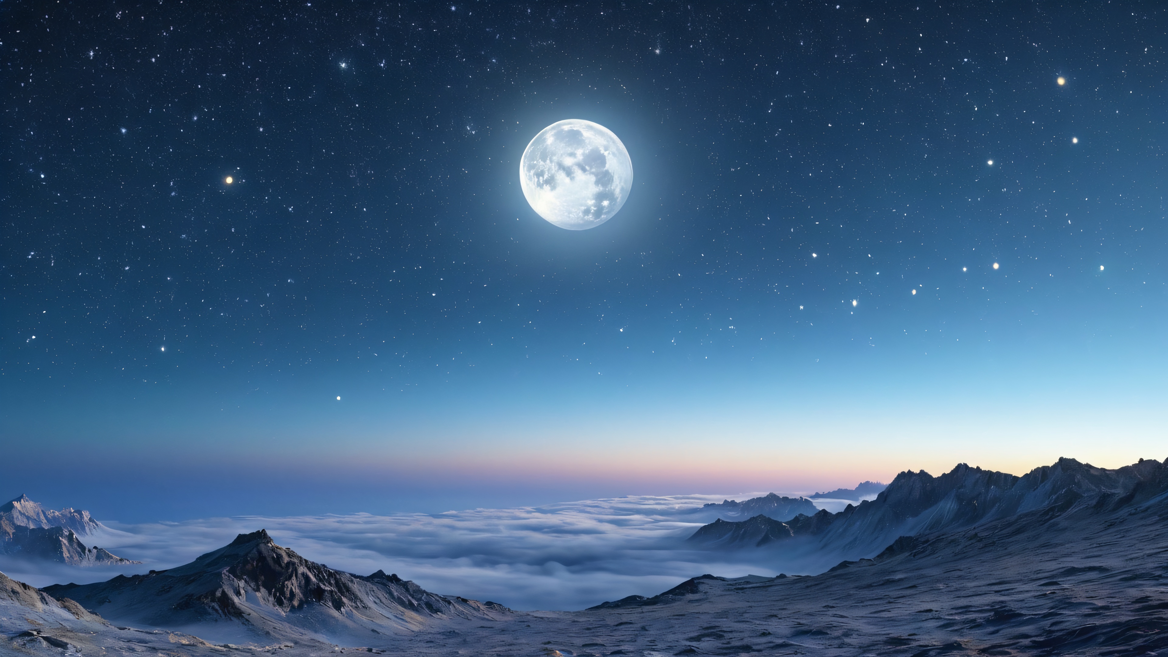 This breathtaking 4K desktop wallpaper captures the serene beauty of a majestic full moon suspended low in the night sky. The moon’s surface is etched with craters, illuminated by the soft glow of nearby stars. A halo of wispy clouds surrounds the moon, creating a sense of depth and dimensionality. The dark blue sky is filled with a tapestry of stars, with the moon as the central focus. A misty horizon hints at a vast, celestial expanse, inviting the viewer to contemplate the mysteries of the universe.